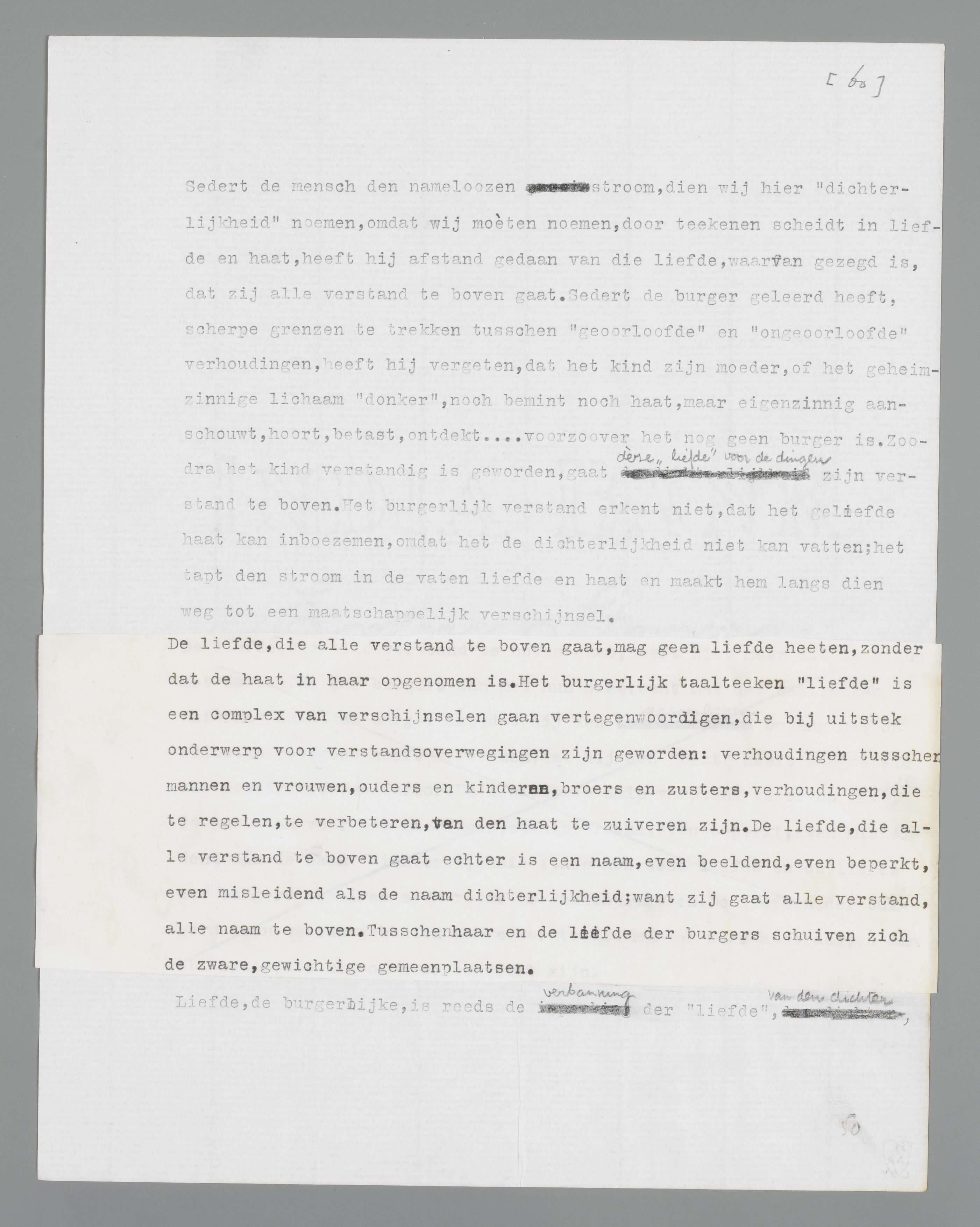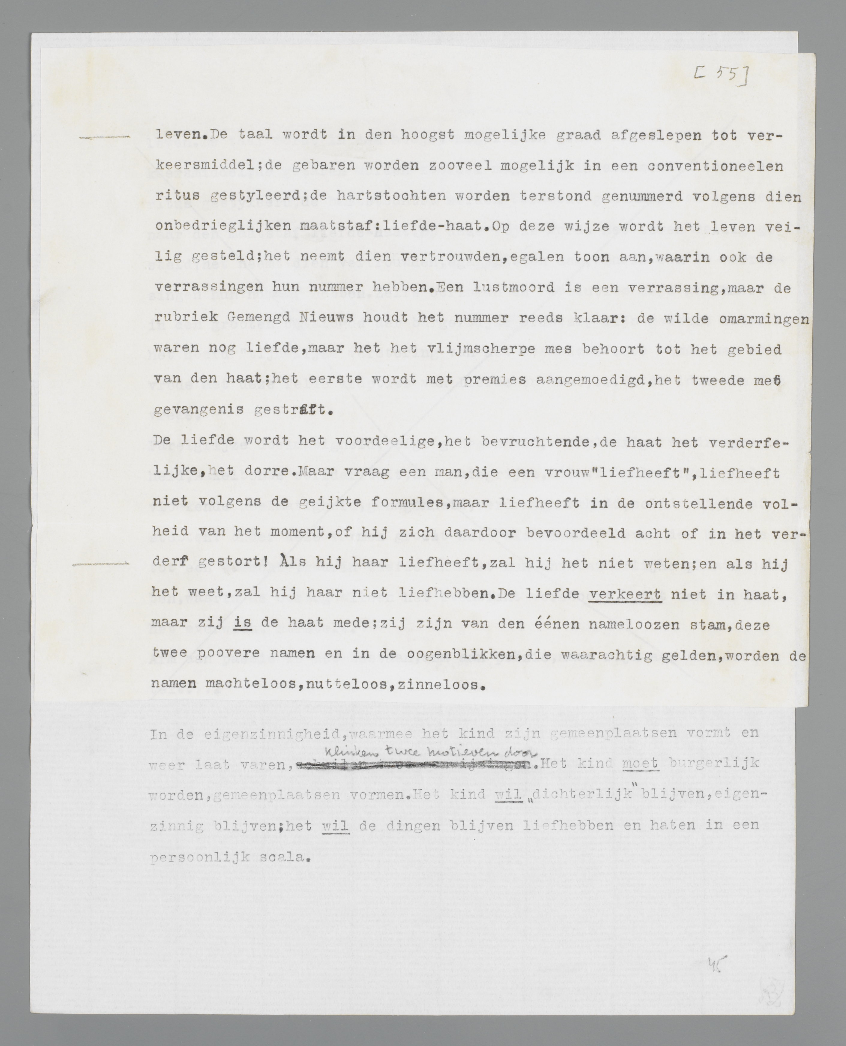 Sedert de mensch den nameloozen stroom, dien wij hier ‘dichterlijkheid’ noemen, omdat wij moèten noemen, door teekenen scheidt in liefde en haat, heeft hij afstand gedaan van die liefde, waarvan gezegd is, dat zij alle verstand te boven gaat. Sedert de burger geleerd heeft, scherpe grenzen te trekken tusschen ‘geoorloofde’ en ‘ongeoorloofde’ verhoudingen, heeft hij vergeten, dat het kind zijn moeder, of het geheimzinnige lichaam ‘donker’, noch bemint noch haat, maar eigenzinnig aanschouwt, hoort, betast, ontdekt... voorzoover het nog geen burger is. Zoodra het kind verstandig is geworden, gaat deze ‘liefde’ voor de dingen zijn verstand te boven. Het burgerlijk verstand erkent niet, dat het geliefde haat kan inboezemen, omdat het de dichterlijkheid niet kan vatten; het tapt den stroom in de vaten liefde en haat en maakt hem langs dien weg tot een maatschappelijk verschijnsel.