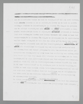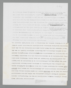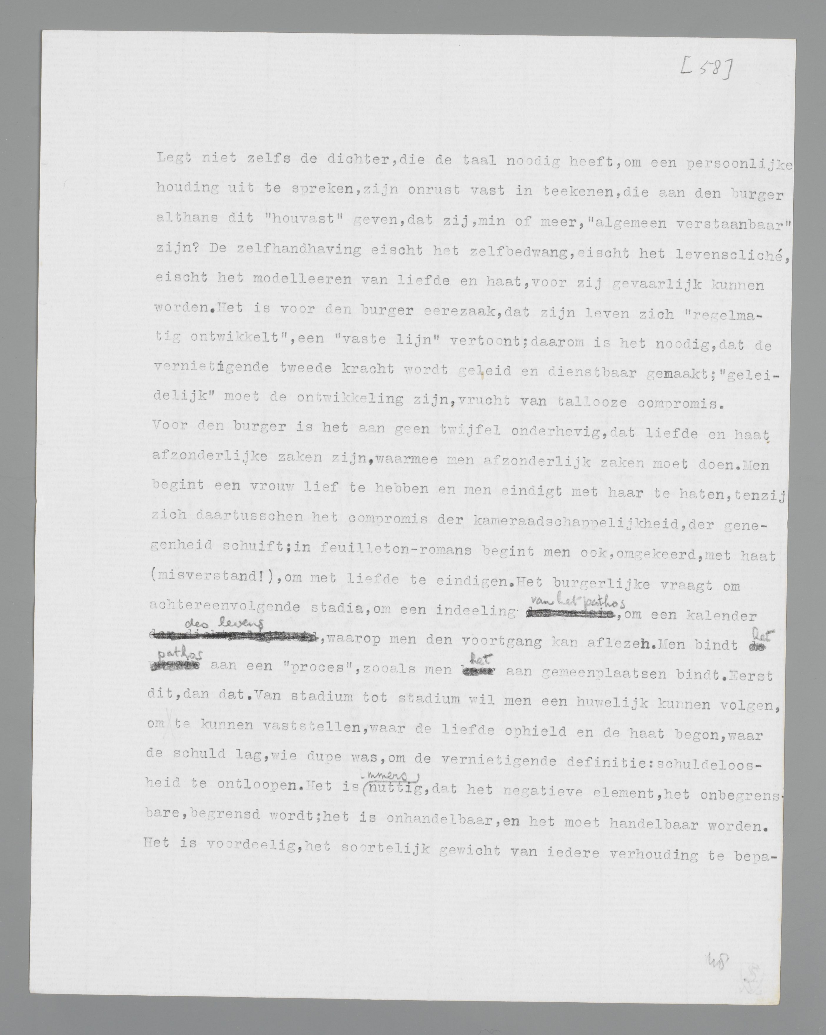 Voor den burger is het aan geen twijfel onderhevig, dat liefde en haat afzonderlijke zaken zijn, waarmee men afzonderlijk zaken moet doen. Men begint een vrouw lief te hebben en men eindigt met haar te haten, tenzij zich daartusschen het compromis der kameraadschappelijkheid, der genegenheid schuift; in feuilleton-romans begint men ook, omgekeerd, met haat (misverstand!), om met liefde te eindigen. Het burgerlijke vraagt om achtereenvolgende stadia, om een indeeling van het pathos, om een kalender des levens, waarop men den voortgang kan aflezen. Men bindt het pathos aan een ‘proces’, zooals men het aan gemeenplaatsen bindt. Eerst dit, dan dat. Van stadium tot stadium wil men een huwelijk kunnen volgen, om te kunnen vaststellen, waar de liefde ophield en de haat begon, waar de schuld lag, wie dupe was, om de vernietigende definitie: schuldeloosheid te ontloopen. Het is immers nuttig, dat het negatieve element, het onbegrensbare, begrensd wordt; het is onhandelbaar, en het moet handelbaar worden. Het is voordeelig, het soorte-