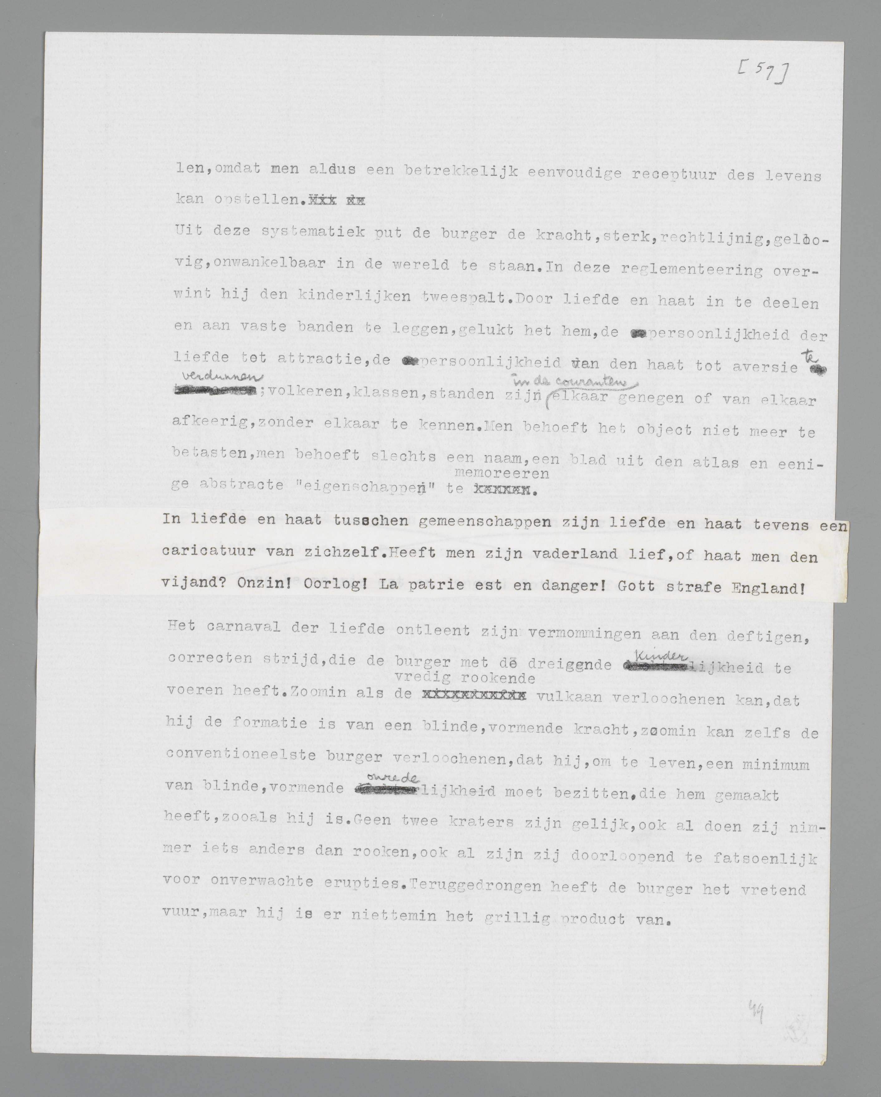 In liefde en haat tusschen gemeenschappen zijn liefde en haat tevens een caricatuur van zichzelf. Heeft men zijn vaderland lief, of haat men den vijand? Onzin! Oorlog! La patrie est en danger! Gott strafe England!