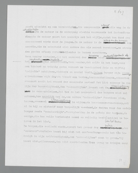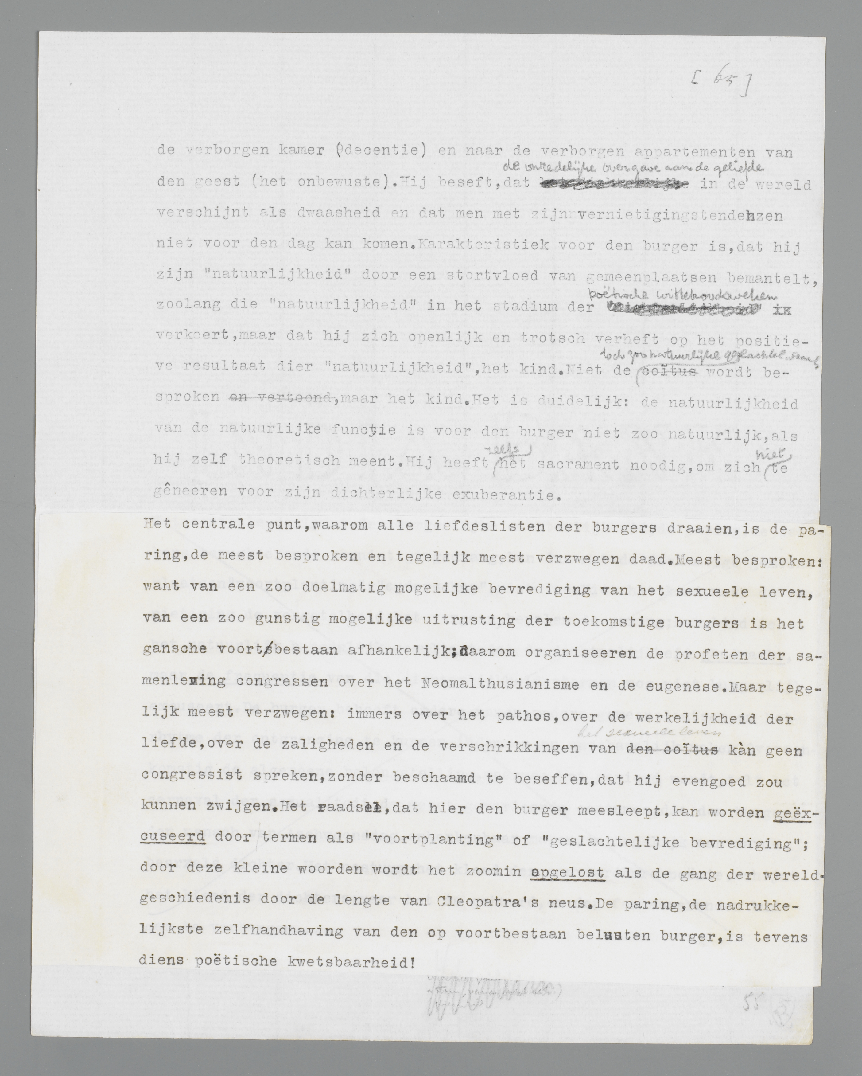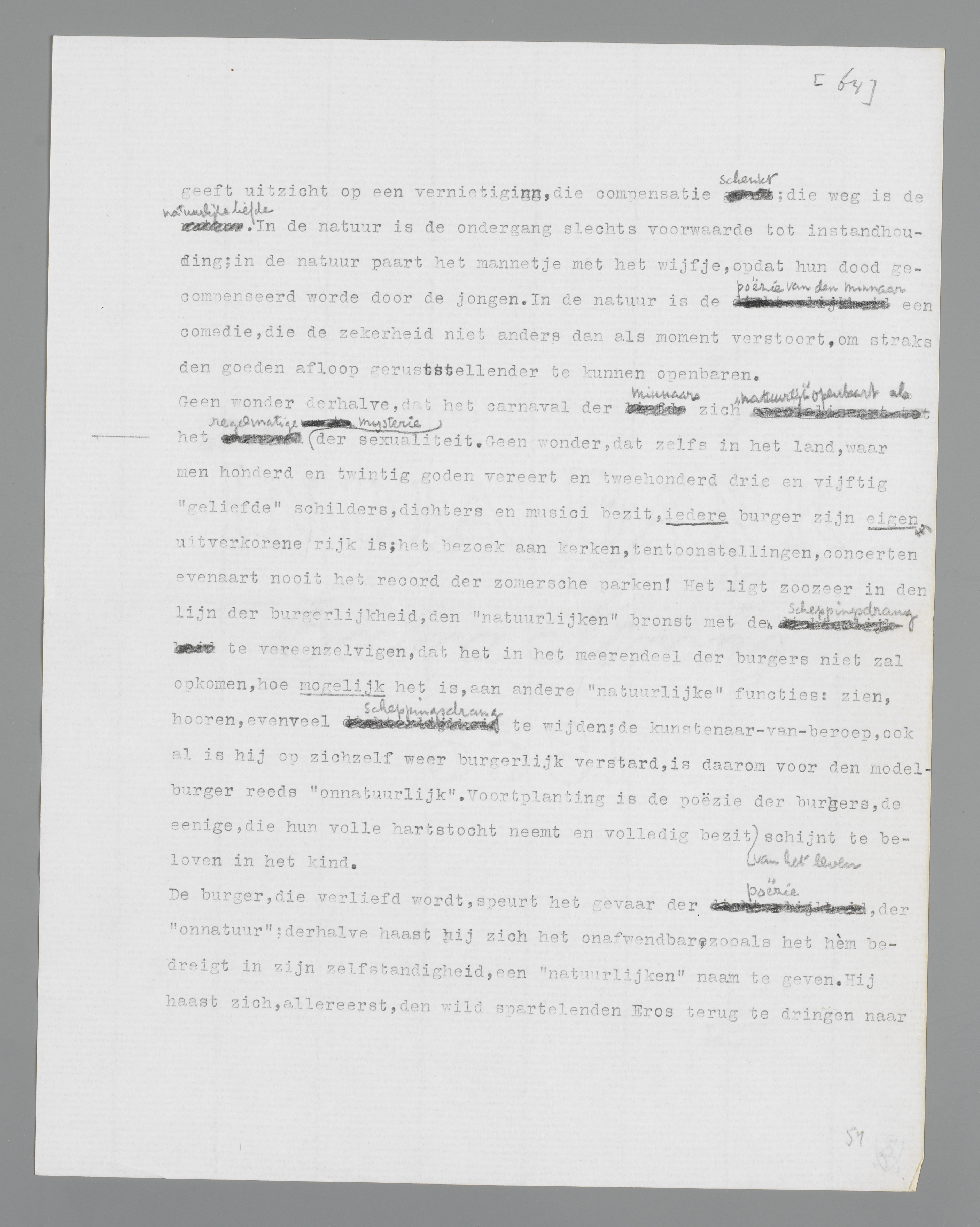 De drang tot poëzie, tot vernietiging van zijn gemeenplaatsenbestaan, is voor den burger het sterkst en onafwijsbaarst in de ‘natuurlijke’ sexueele verhouding. Wat wil het zeggen, dat de sexualiteit de natuurlijkste zaak ter wereld is? Dat de burger zijn scheppingsdrang moet concentreeren op de functie, die hem de grootst mogelijke waarborg biedt, dat zijn vernietigingsdrift een burgerlijke vrucht zal dragen: de paring. Natuur is voortzetting, instandhouding, feilloos zich voortzettend, feilloos zich in stand houdend, waar twee individuen zich in hoogste zaligheid schijnen te vernietigen. Na-