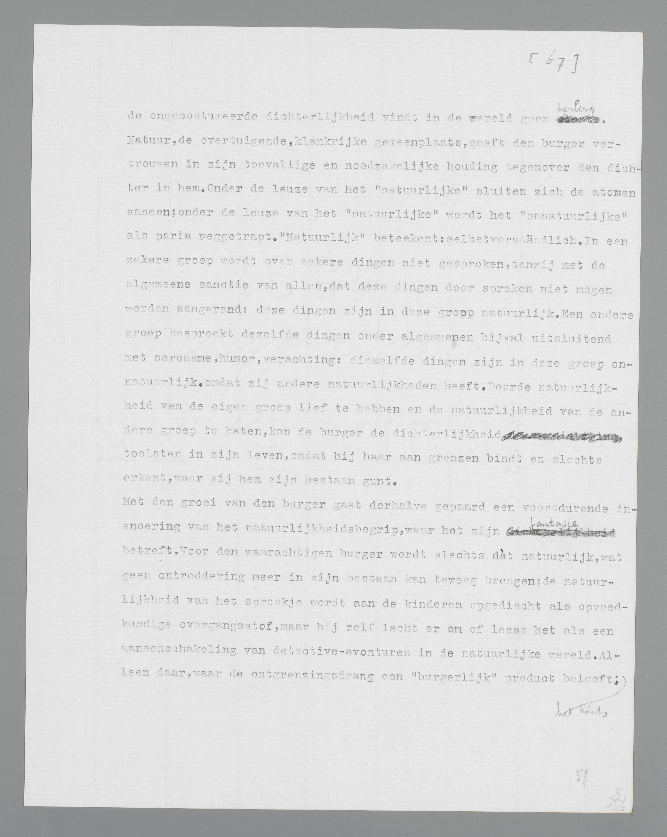 De burger, die verliefd wordt, speurt het gevaar der poëzie, der ‘onnatuur’; derhalve haast hij zich het onafwendbare, zooals het hèm bedreigt in zijn zelfstandigheid, een ‘natuurlijken’ naam te geven. Hij haast zich, allereerst, den wild spartelenden Eros terug te dringen naar de verborgen kamer (decentie) en naar de verborgen appartementen van den geest (het onderbewuste). Hij beseft, dat de onredelijke overgave aan de geliefde in de wereld verschijnt als dwaasheid en dat men met zijn vernietigingstendenzen niet voor den dag kan komen. Karakteristiek voor den burger is, dat hij zijn ‘natuurlijkheid’ door een stortvloed van gemeenplaatsen bemantelt, zoolang die ‘natuurlijkheid’ in het stadium der poëtische wittebroodsweken verkeert, maar dat hij zich openlijk en trotsch verheft op het positieve resultaat dier ‘natuurlijkheid’, het kind. Niet de toch zoo