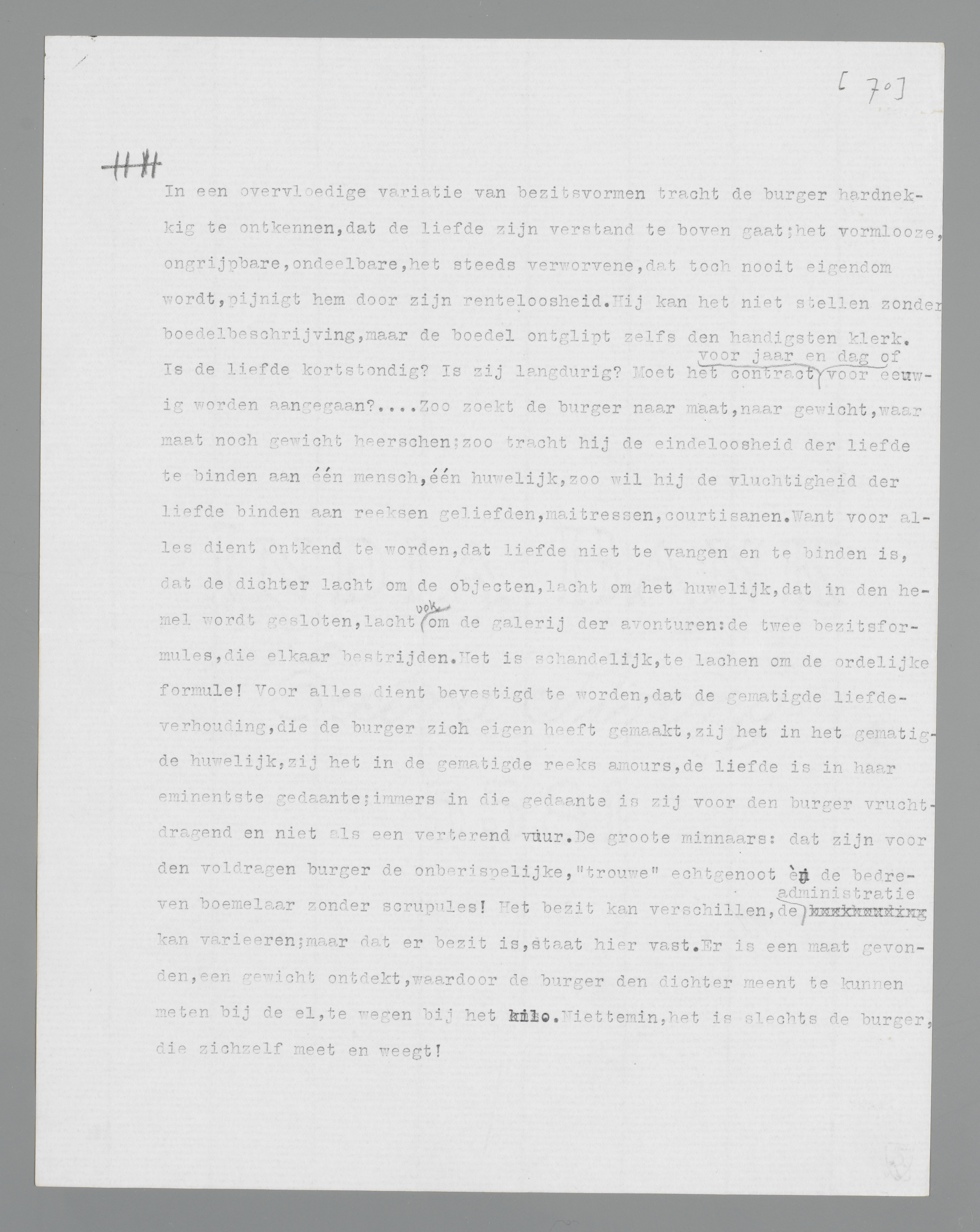 Het bezit is noodzakelijk, opdat de liefde een burgerlijke ‘verhouding’ worde. In het bezit hervindt de burger zijn verstoord samenzijn met andere burger-atomen: A heeft een vrouw, B heeft een vrouw. In het bezit hervindt de burger de zekerheid, om den ander, die andere atoom-wetten volgt, te verachten: ik heb een wettige vrouw, B heeft een maîtresse. Het bezit verdringt de fantasie naar het geheime, naar het obscene, naar het cynische. De geheimzinnigheid, de obsceniteit, het cynisme in de sexueele verhouding, maar evenzeer de frissche, lustige openhartigheid der ‘natuurmenschen’ zijn zoovele teekenen, dat de burger met den dichter in hem nooit, nergens raad weet. Alle liefde moet, om bruikbaar te zijn, geformuleerd worden in een bezitscijfer, dat niets van de liefde bevat. Alle liefde stelt zichzelf de grens in den man, die zich handhaven, in de vrouw, die zich slechts economisch vergeten wil.