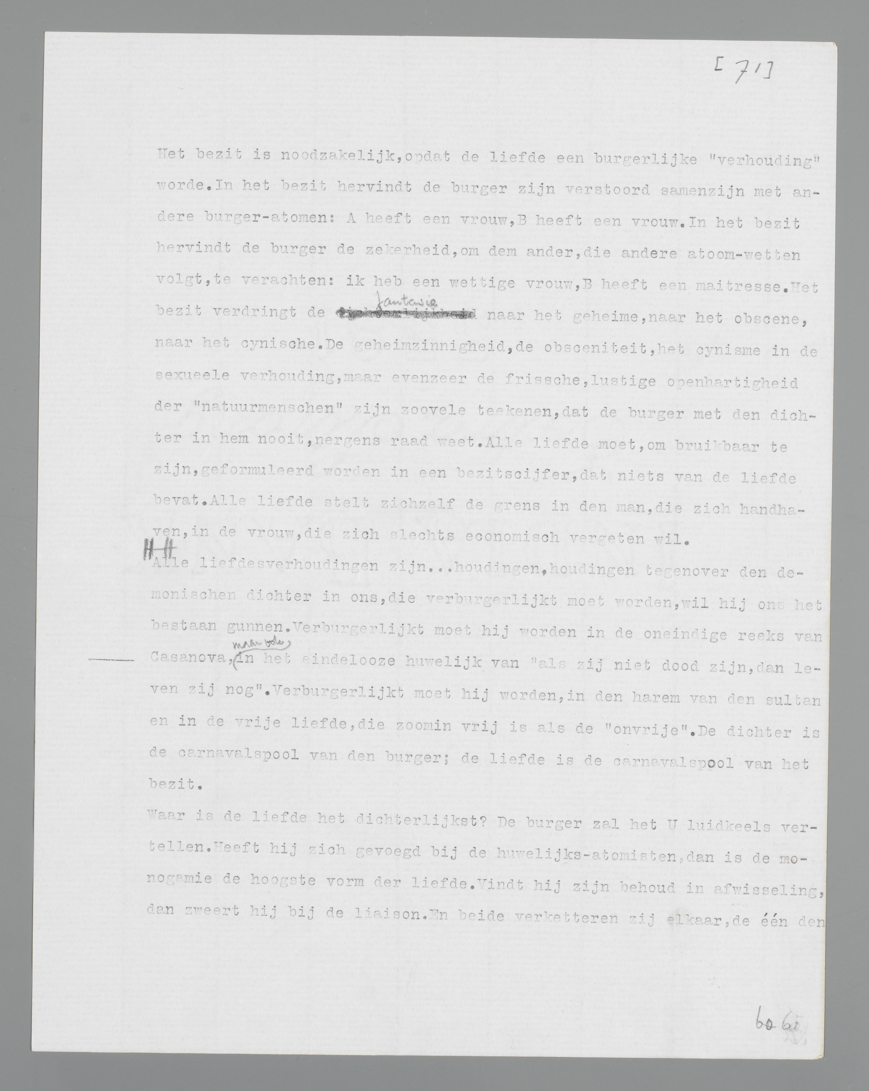 Alle liefdesverhoudingen zijn... houdingen, houdingen tegenover den demonischen dichter in ons, die verburgerlijkt moet worden, wil hij ons het bestaan gunnen. Verburgerlijkt moet hij worden in de oneindige reeks van Casanova, maar ook in het eindelooze huwelijk van ‘als zij niet dood zijn, dan leven zij nog’. Verburgerlijkt moet hij worden, in den harem van den sultan en in de vrije liefde, die zoomin vrij is als de ‘onvrije’. De dichter is de carnavalspool van den burger; de liefde is de carnavalspool van het bezit.