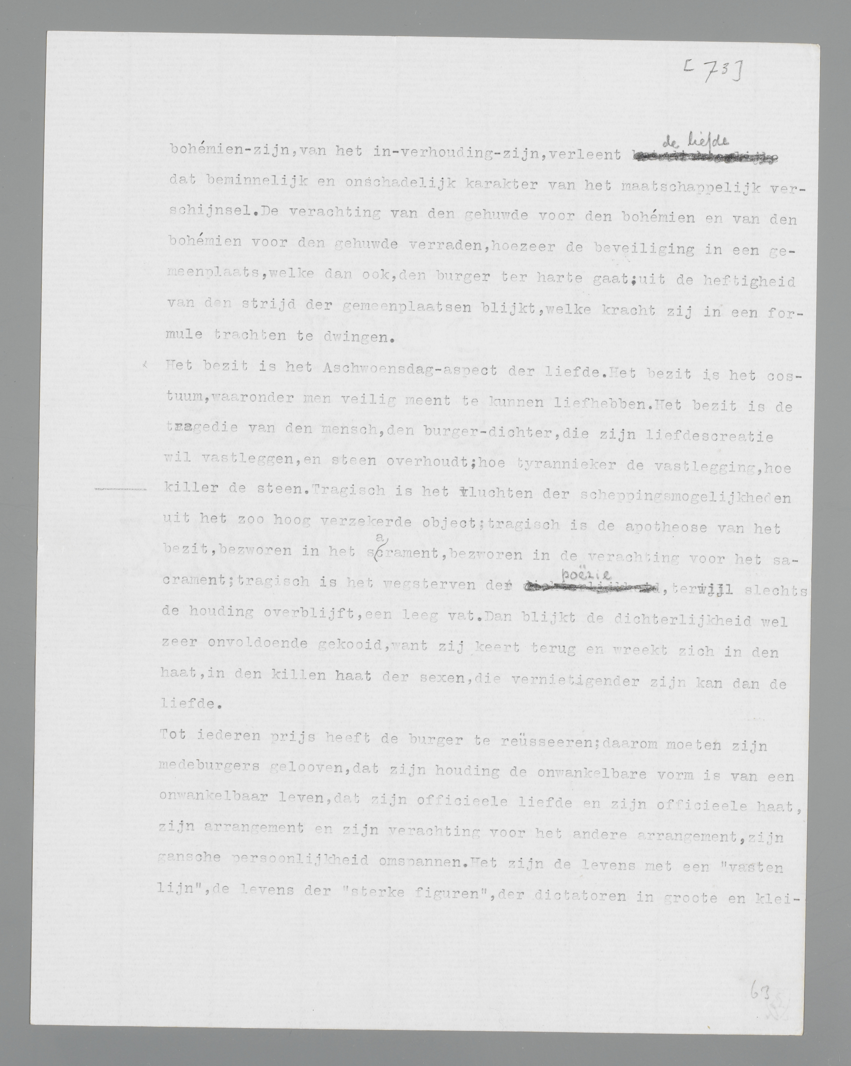 Het bezit is het Aschwoensdag-aspect der liefde. Het bezit is het costuum, waaronder men veilig meent te kunnen liefhebben. Het bezit is de tragedie van den mensch, den burger-dichter, die zijn liefdescreatie wil vastleggen, en steen overhoudt; hoe tyrannieker de vastlegging, hoe killer de steen. Tragisch is het vluchten der scheppingsmogelijkheden uit het zoo hoog verzekerde object; tragisch is de apotheose van het bezit, bezworen in het sacrament, bezworen in de verachting voor het sacrament; tragisch is het wegsterven der poëzie, terwijl slechts de houding overblijft, een leeg vat. Dan blijkt de dichterlijkheid wel zeer onvoldoende gekooid, want zij keert terug en wreekt zich in den haat, in den killen haat der sexen, die vernietigender zijn kan dan de liefde.