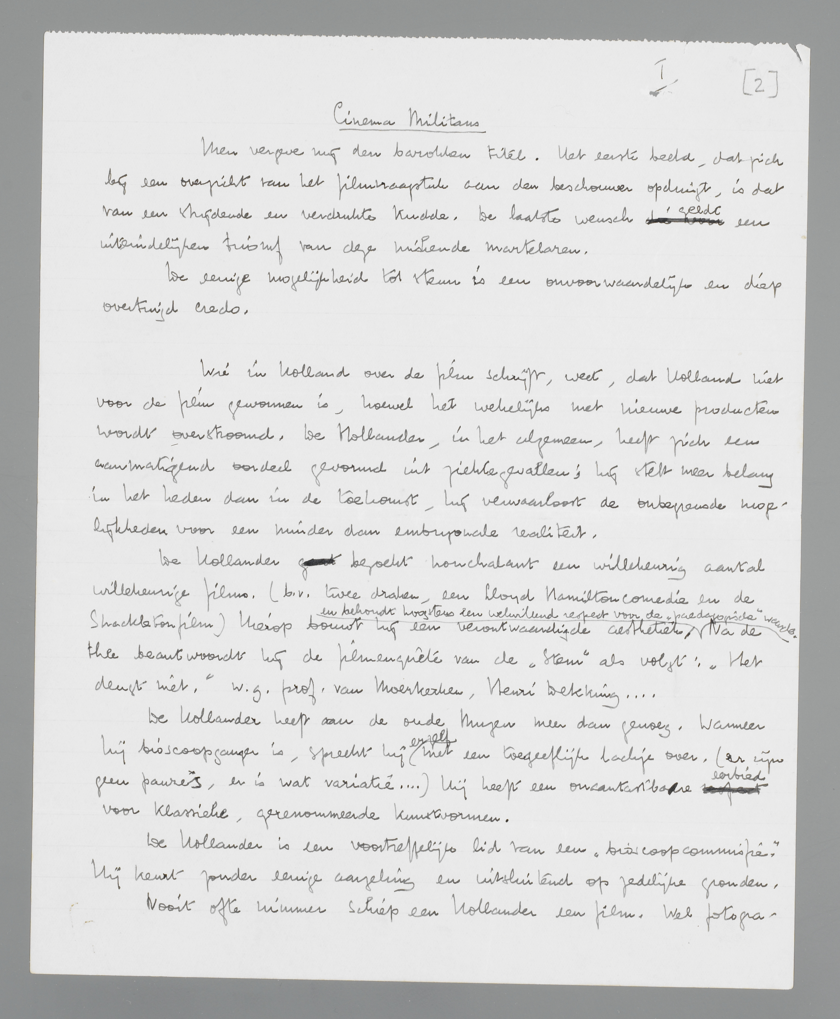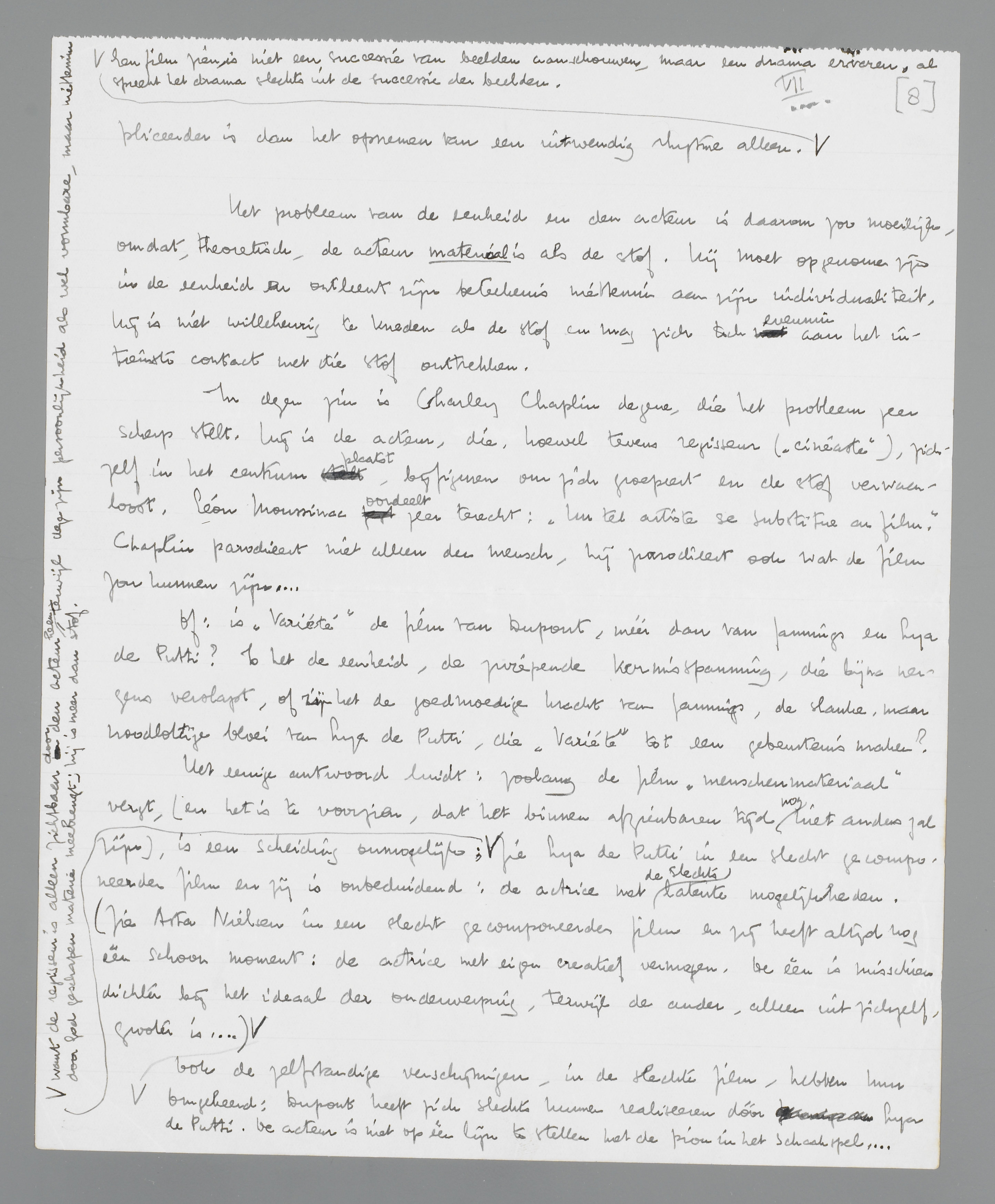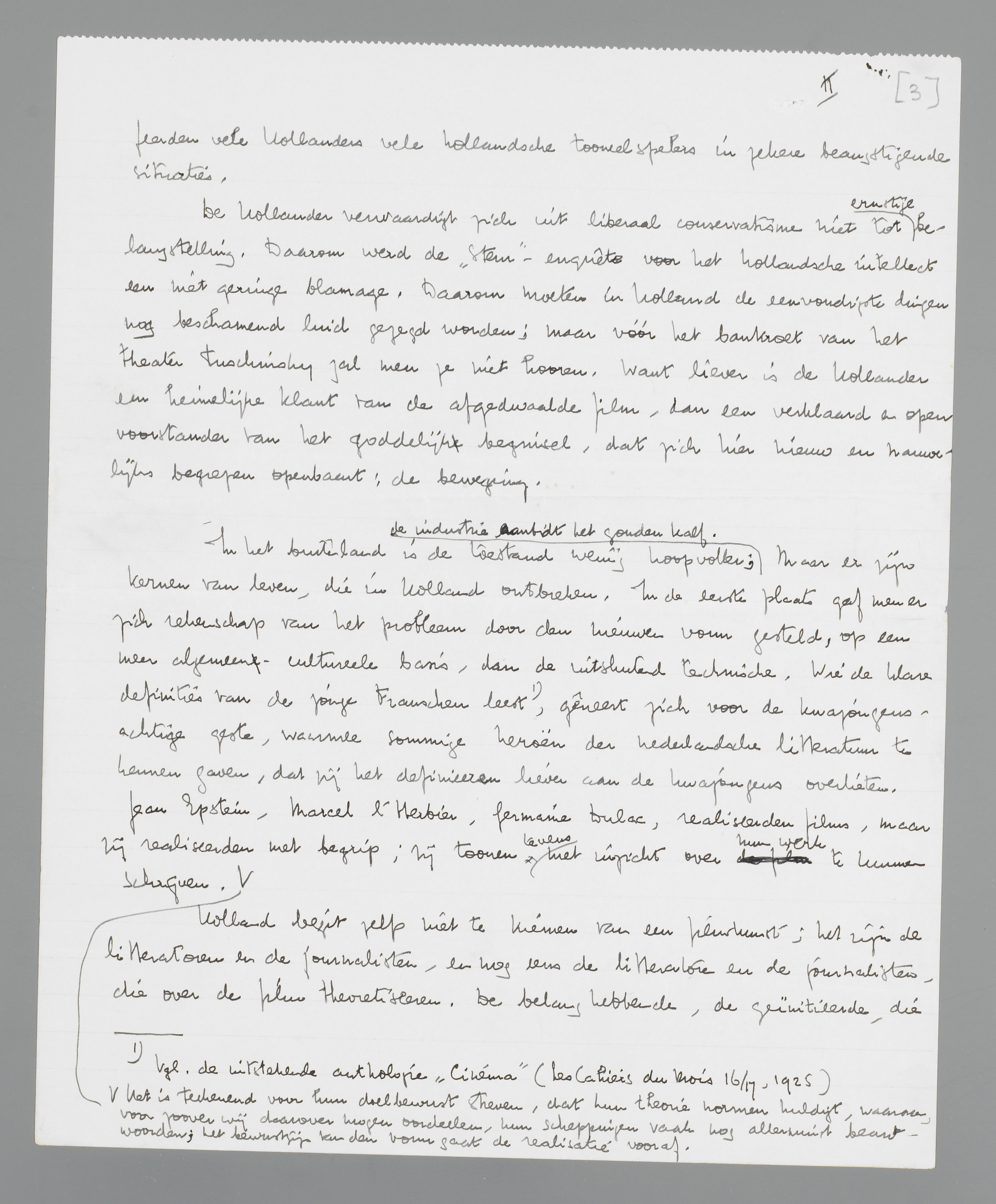 Holland bezit pas de eerste kiemen van een filmkunst; het zijn de litteratoren en de journalisten, en nog eens de litteratoren en de journalisten, die over de film theoretiseeren. De belanghebbende, die zichzelf verdedigt met de prachtige taaiheid van één, die naar leven hijgt, blijft nog zeldzaam...