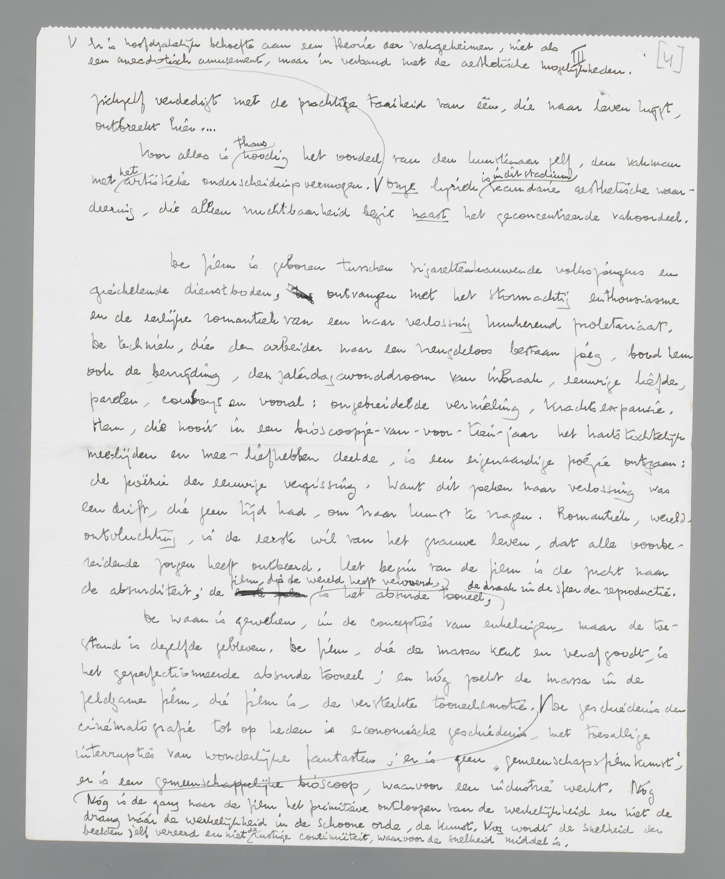 De waan is geweken, in de concepties van enkelingen, maar de toestand is, feitelijk, dezelfde gebleven. De film, die de massa kent en verafgoodt, is het geperfectionneerde absurde tooneel; en nóg zoekt de massa in de zeldzame film, die film is, de versterkte tooneel-emotie. Nóg is de gang naar de film het primitieve ontloopen van de werkelijkheid en niet de drang náár de werkelijkheid in de schoone orde, de kunst. Nog wordt de snelheid der beelden zèlf vereerd en niet de rustige continuïteit, waarvoor de snelheid middel is. De geschiedenis der cinematografie tot op heden is economische geschiedenis, met toevallige interrupties van wonderlijke fantasten; er is geen ‘gemeenschapsfilmkunst’, er is een gemeenschappelijke bioscoop, waarvoor een