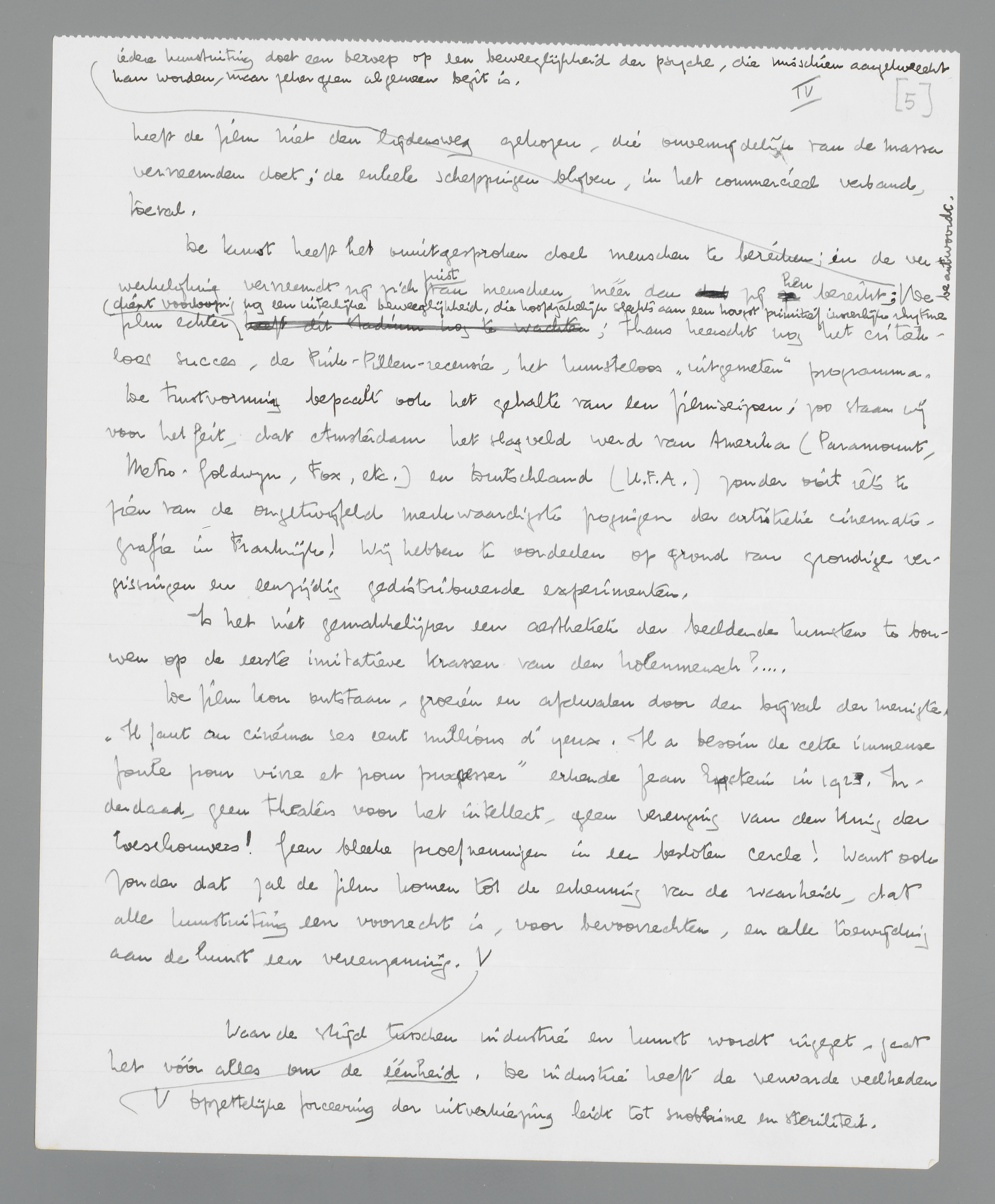 Is het niet gemakkelijker een aesthetiek der beeldende kunsten te bouwen op de eerste imitatieve krassen van den holenmensch?... De film kon ontstaan, groeien en afdwalen door den bijval der menigte. ‘Il faut au cinéma ses cent millions d'yeux. Il a besoin de cette immense foule pour vivre et pour progresser’ erkende Jean Epstein in 1923. Inderdaad, geen theaters voor het intellect, geen verenging van den kring der toeschouwers! Geen bleeke proefnemingen in een besloten cercle! Deze cercle vormt zich vanzelf! Zonder opzettelijke inperking zal de film komen tot de erkenning van de waarheid, dat alle kunstuiting een voorrecht is, voor bevoorrechten, en alle toewijding aan de kunst een vereenzaming. Opzettelijke forceering der uitverkiezing leidt tot snobisme en steriliteit.