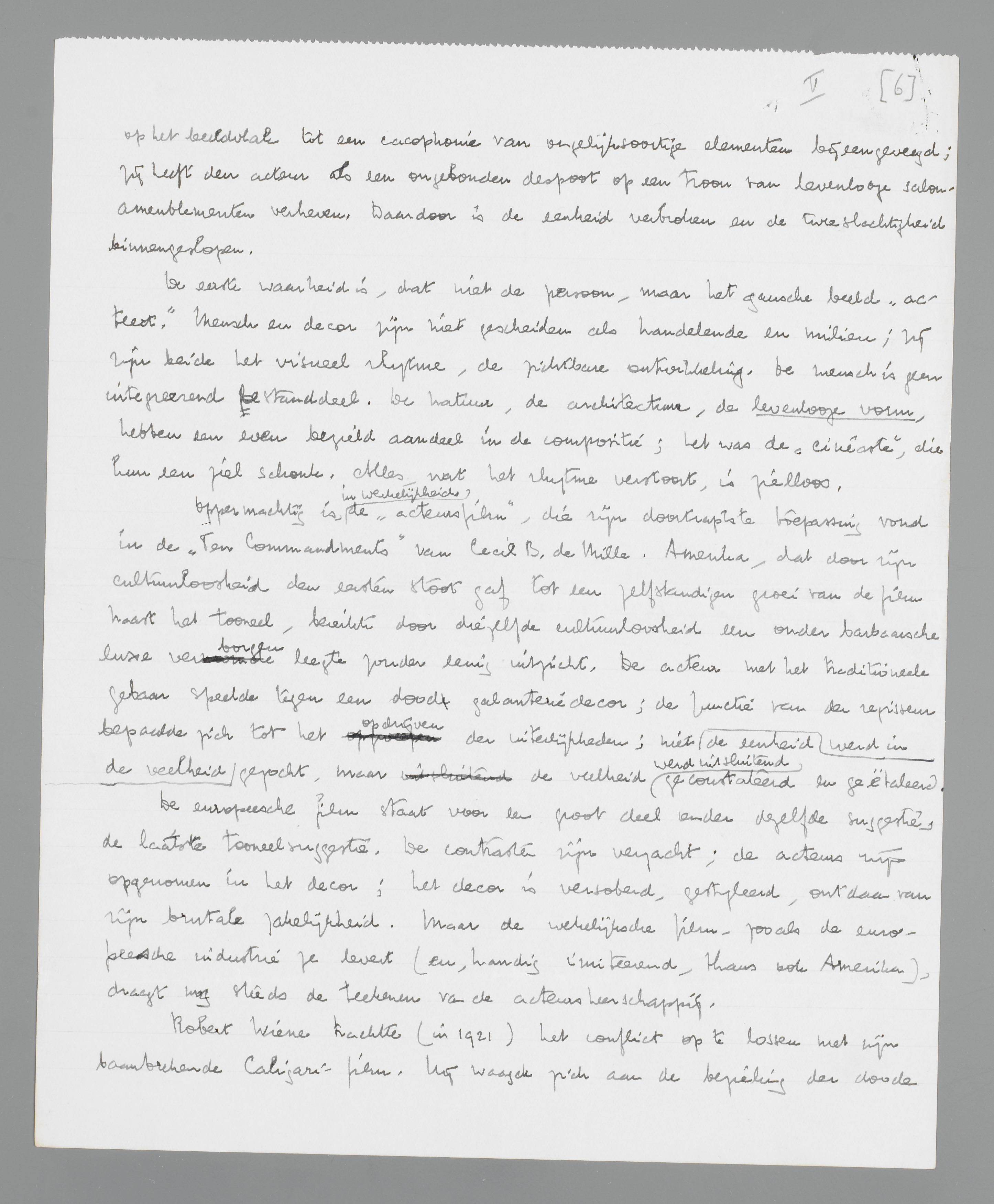 Oppermachtig bleef, in werkelijkheid, de ‘acteursfilm’, die wellicht eens zijn doortraptste en onhandigste toepassing vond in de ‘Ten Commandments’ van Cecil B. de Mille. Amerika, dat door zijn cultuurloosheid den eersten stoot gaf tot een zelfstandigen groei van de film naast het tooneel, bereikte door diezelfde cultuurloosheid een onder barbaarsche luxe verborgen leegte zonder eenig uitzicht. De acteur met het traditioneele gebaar speelde tegen een dood galanteriedecor; de functie van den regisseur bepaalde zich tot het opdrijven der uiterlijkheden; niet werd in de veelheid de eenheid gezocht, maar de veelheid werd uitsluitend geconstateerd en geëtaleerd.