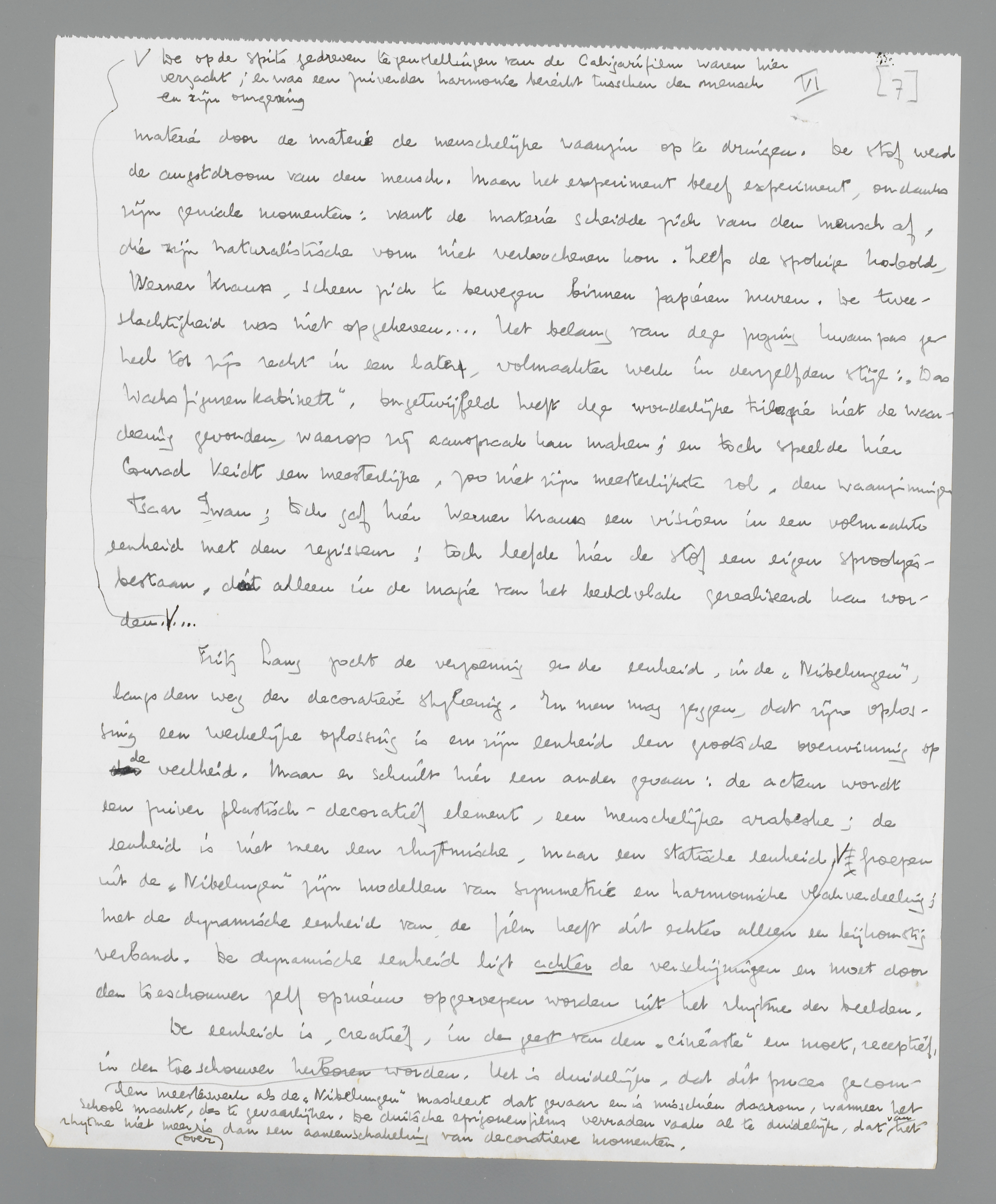 Fritz Lang zocht de verzoening en de eenheid, in de ‘Nibelungen’, langs den weg der decoratieve styleering. En men mag zeggen, dat zijn oplossing een werkelijke oplossing is en zijn eenheid een grootsche overwinning op de veelheid. Maar er schuilt hier een ander gevaar: de acteur wordt een zuiver plastisch-decoratief element, een menschelijke arabeske; de eenheid is niet meer een rhytmische, maar een statische eenheid. Een werk als de ‘Nibelungen’ maskeerde dat gevaar en was misschien daarom, toen het school maakte, des te gevaarlijker. De duitsche epigonenfilms verraden vaak al te duidelijk, dat van het rhytme niet meer over is dan een aaneenschakeling van decoratieve momenten. Groepen uit de ‘Nibelungen’ zijn modellen van symmetrie en harmonische vlakverdeeling; met de dynamische eenheid van de film heeft dit echter alleen een bijkomstig verband. De dynamische eenheid ligt achter de ver-