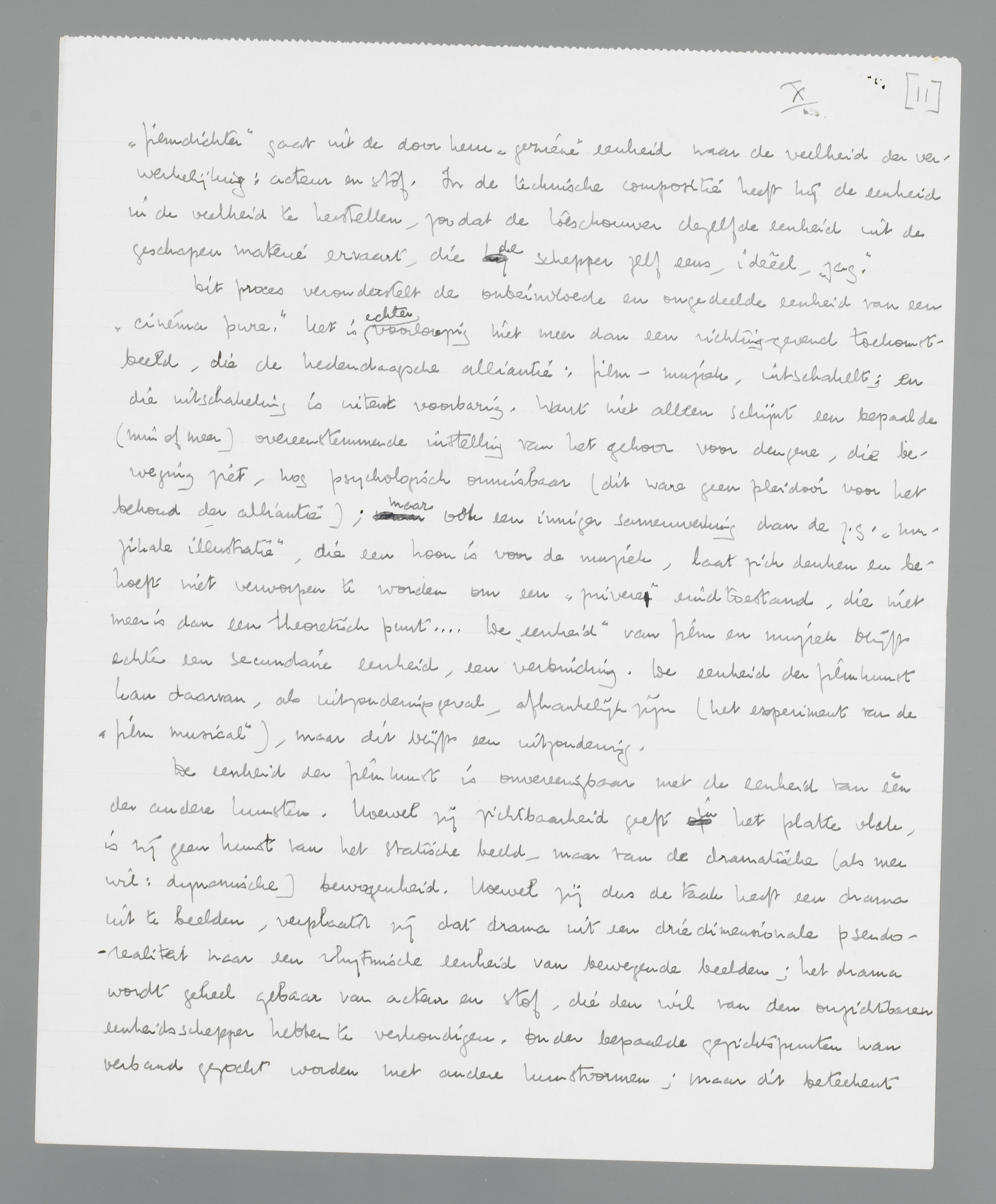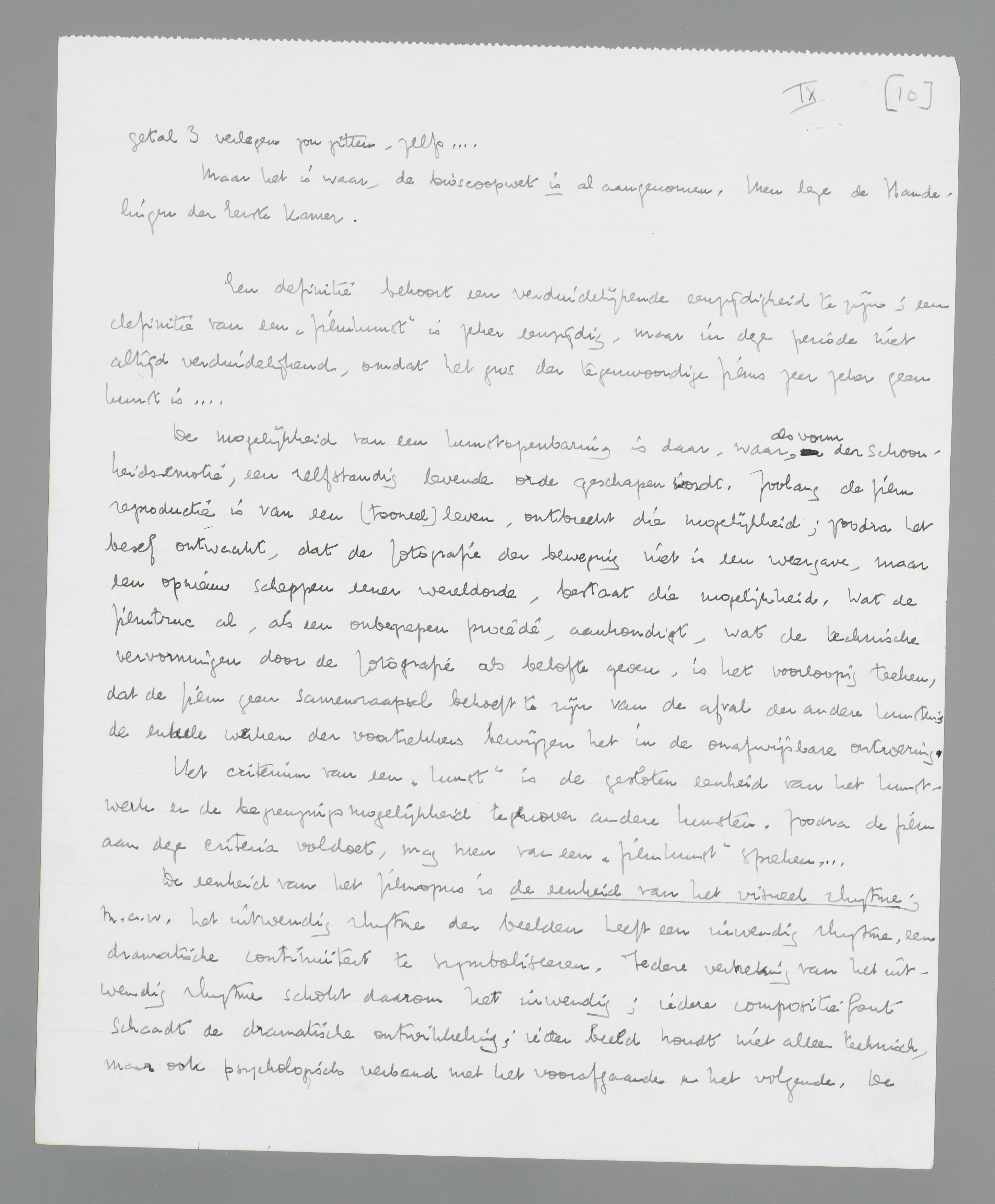 De eenheid van het filmopus is de eenheid van het visueel rhytme; m.a.w. het uitwendig rhytme der beelden heeft een inwendig rhytme, een dramatische continuïteit, te symboliseeren. Iedere verbreking van het uitwendig rhytme schokt daarom het inwendig; iedere compositiefout schaadt de dramatische ontwikkeling; ieder beeld houdt niet alleen technisch, maar ook psychologisch verband met het voorafgaande en het volgende. De ‘filmdichter’ gaat uit de door hem ‘geziene’ eenheid