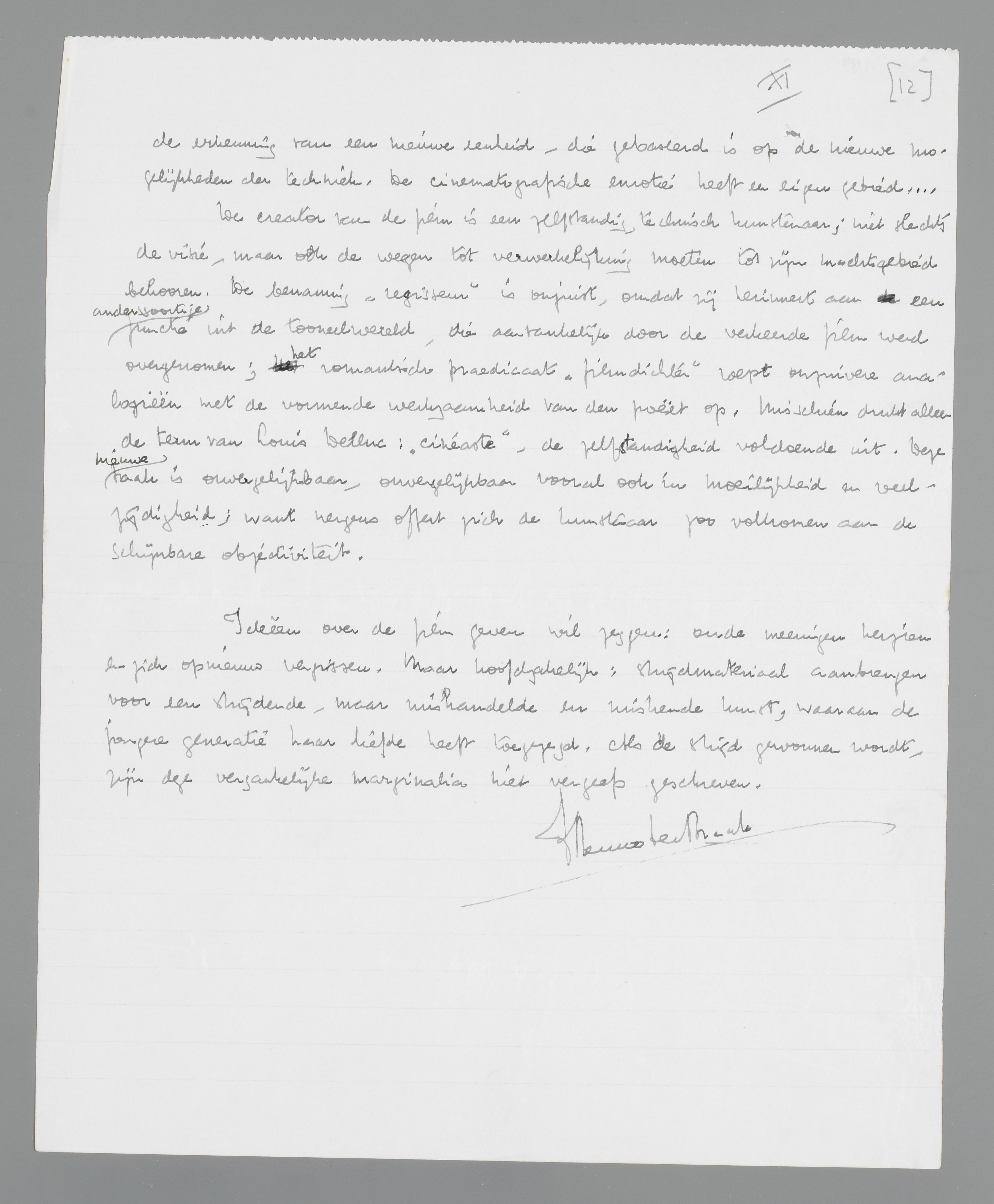 Het criterium van een ‘kunst’ is de gesloten eenheid van het kunstwerk en de begrenzingsmogelijkheid tegenover andere kunsten. Zoodra de film, voor wien ook, aan deze criteria voldoet, mag men van een ‘filmkunst’ spreken...