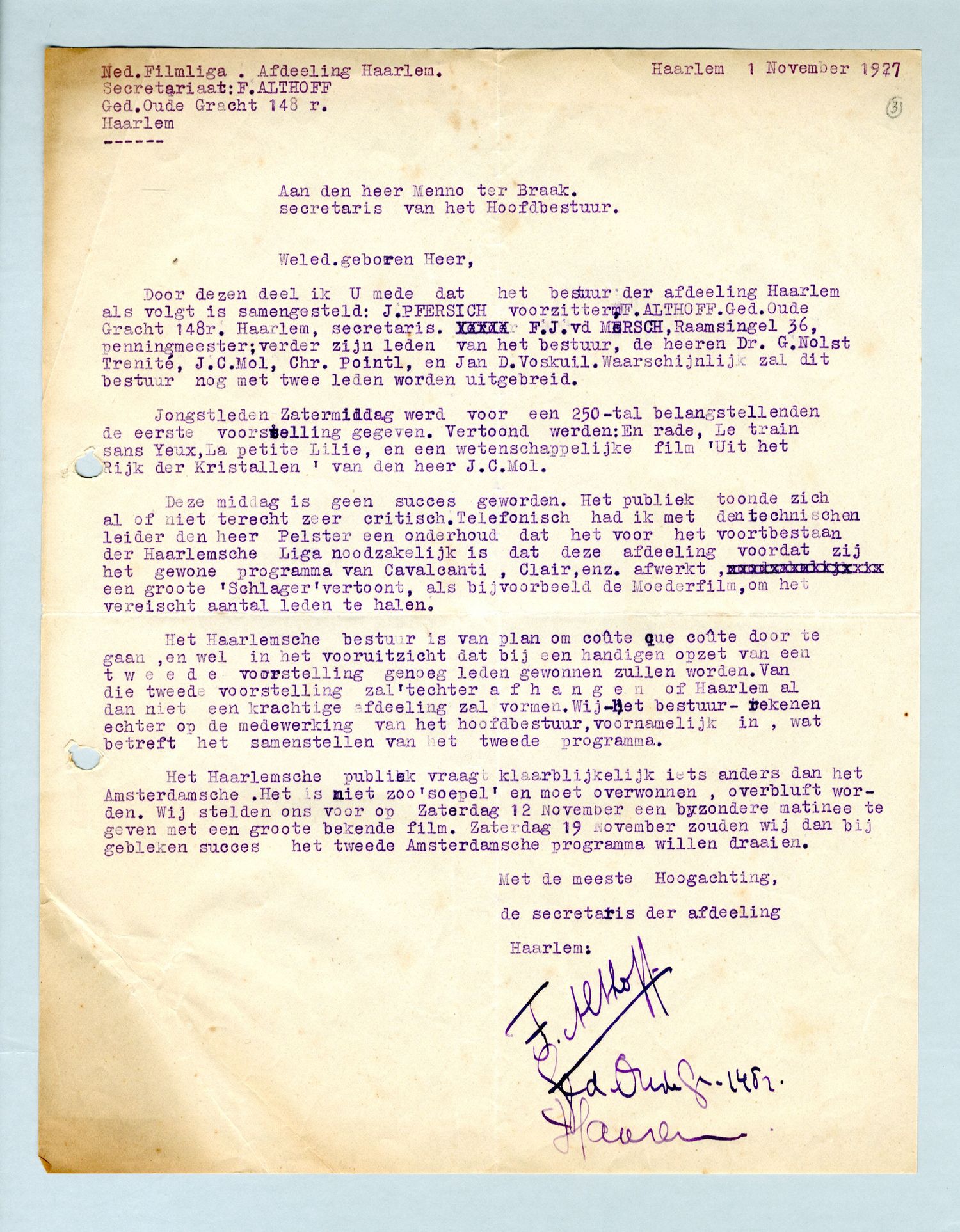 Het Haarlemsche publiek vraagt klaarblijkelijk iets anders dan het Amsterdamsche. Het is niet zoo ‘soepel’ en moet overwonnen, overbluft worden. Wij stelden ons voor op Zaterdag 12 November een bijzondere matinee te geven met een groote bekende film. Zaterdag 19 November zouden wij dan bij gebleken succes het tweede Amsterdamsche programma willen draaien.