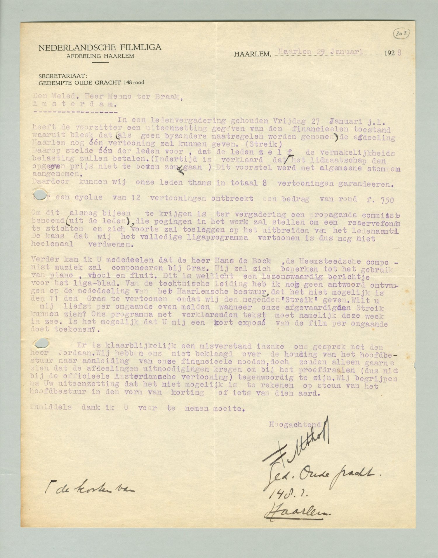 Verder kan ik U mededeelen dat de heer Hans de Bock, de Heemsteedsche componist muziek zal componeeren bij Gras. Hij zal zich beperken tot het gebruik van piano, viool en fluit. Dit is wellicht een lezenswaardig berichtje voor het liga-blad. Van de technische leiding heb ik nog geen antwoord ontvangen op de mededeeling van het Haarlemsche bestuur, dat het niet mogelijk is den 11den Gras te vertoonen omdat wij den negenden Streik geven.