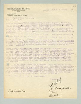 Er is klaarblijkelijk een misverstand inzake ons gesprek met den heer Jordaan. Wij hebben ons niet beklaagd over de houding van het hoofdbestuur naar aanleiding van onze financieele nooden, doch zouden alleen gaarne zien dat de afdeelingen uitnoodigingen kregen om bij het proefdraaien (dus niet bij de officieele Amsterdamsche vertooning) tegenwoordig te zijn. Wij begrijpen na Uw uiteenzetting dat het niet mogelijk is te rekenen op steun van het hoofdbestuur in den vorm van korting of iets van dien aard.