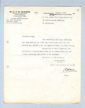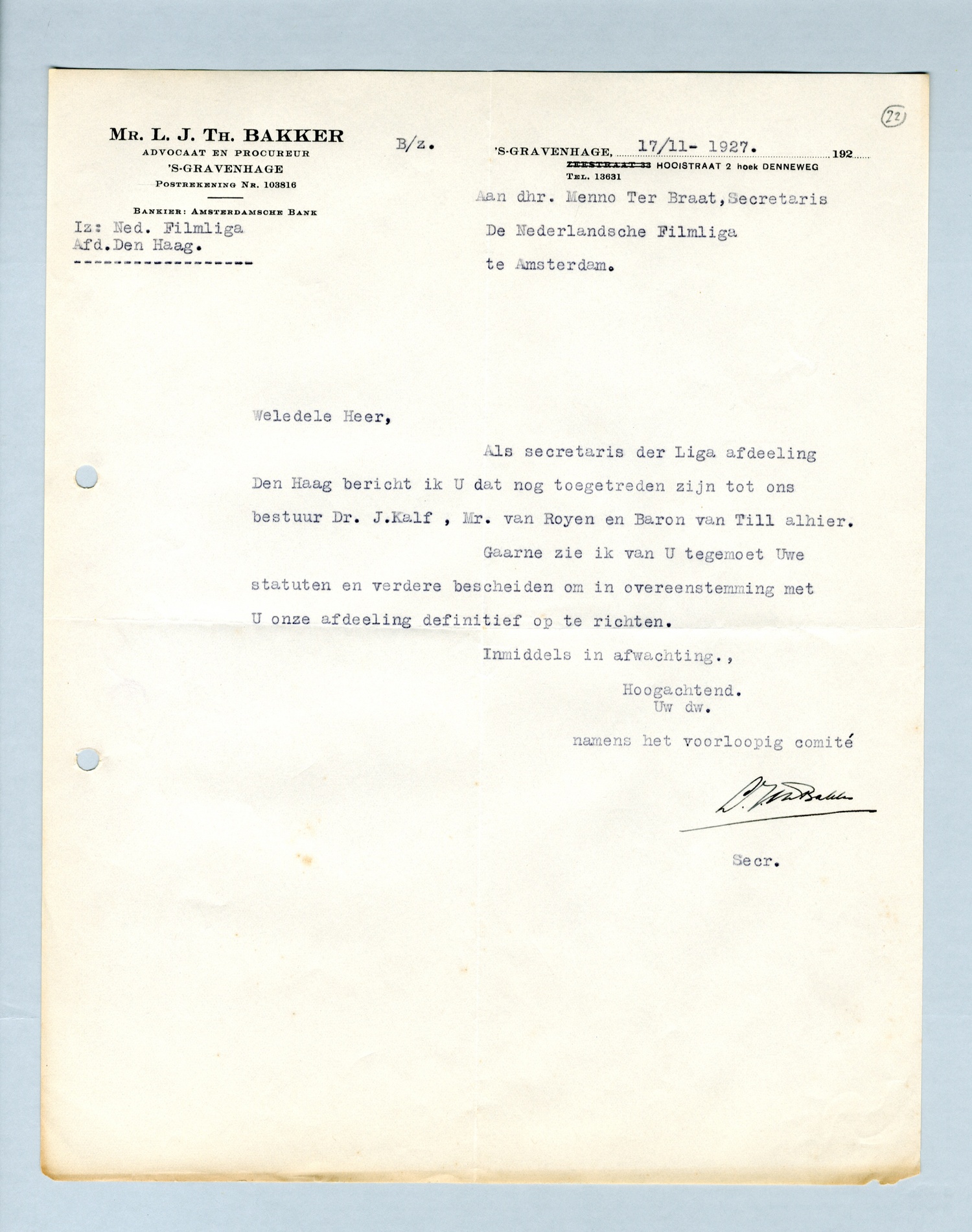 Als secretaris der Liga afdeeling Den Haag bericht ik U dat nog toegetreden zijn tot ons bestuur Dr. J. Kalf, Mr. van Royen en Baron van Till alhier.