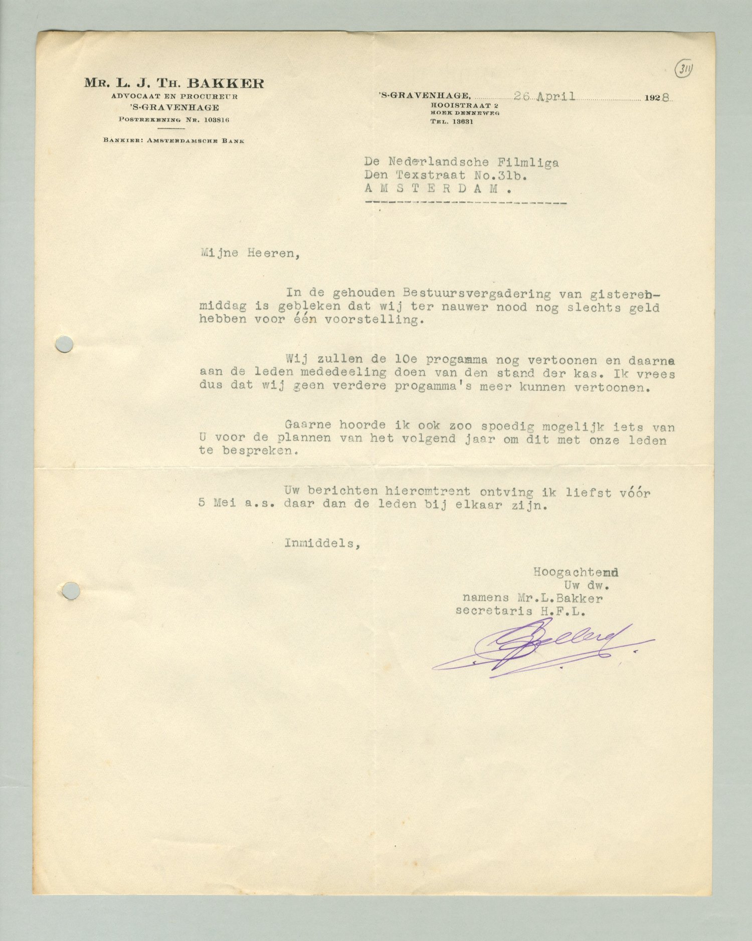 Uw berichten hieromtrent ontving ik liefst vóór 5 Mei a.s. daar dan de leden bij elkaar zijn.