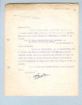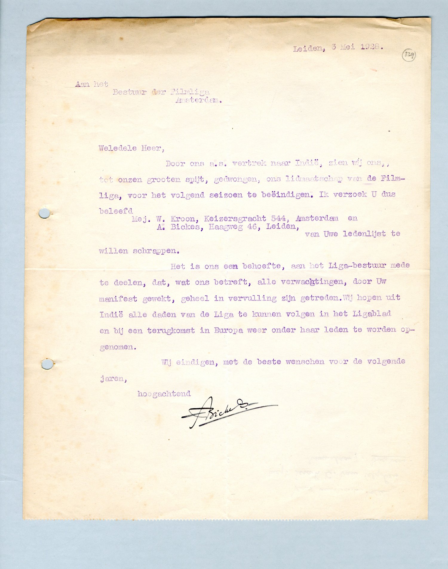 Door ons a.s. vertrek naar Indië, zien wij ons, tot onzen grooten spijt, gedwongen, ons lidmaatschap van de Filmliga, voor het volgend seizoen te beëindigen. Ik verzoek U dus beleefd