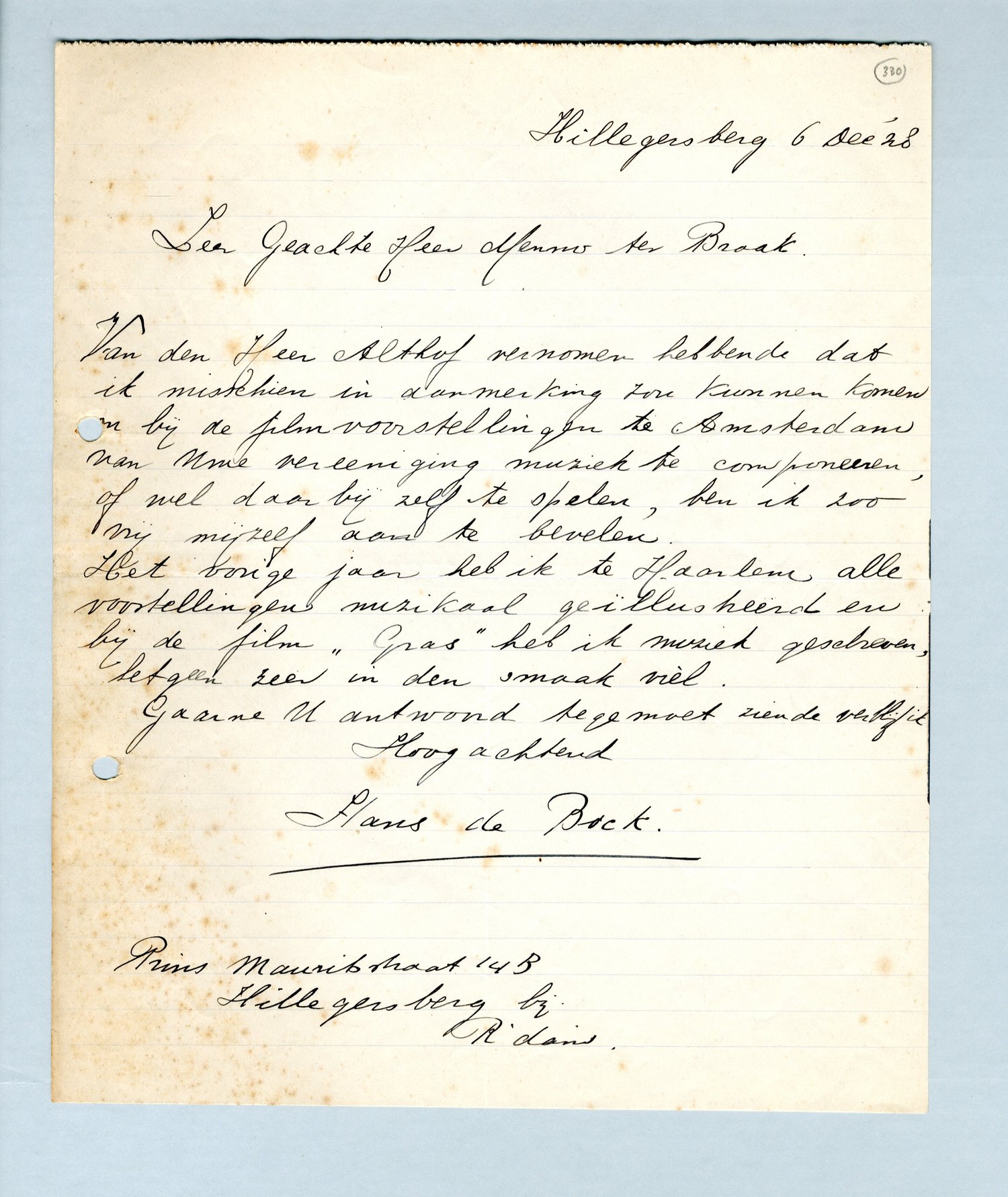 Van den Heer Althof vernomen hebbende dat ik misschien in aanmerking zou kunnen komen om bij de filmvoorstellingen te Amsterdam van Uwe vereeniging muziek te componeeren, of wel daarbij zelf te spelen, ben ik zoo vrij mijzelf aan te bevelen.