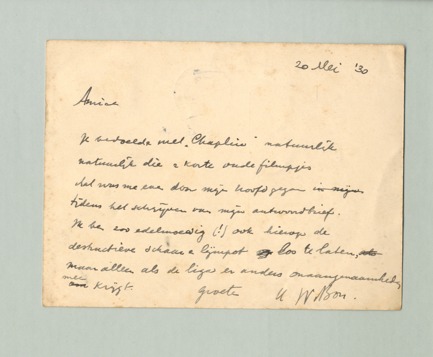 Je bedoelde met ‘Chaplin’ natuurlijk die korte oude filmpjes dat was me even door mijn hoofd gegaan tijdens het schrijven van mijn antwoordbrief. Ik ben zoo edelmoedig (!) ook hierop de destructieve schaar en lijmpot los te laten, maar alleen als de liga er anders onaangenaamheden mee krijgt.