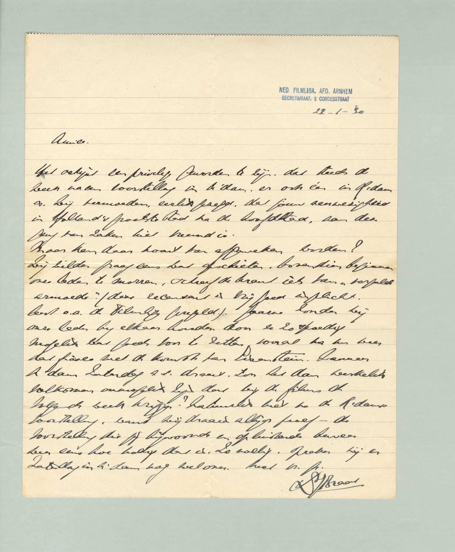 Maar kan daar nooit van afgeweken worden? Wij wilden graag eens wat opschieten. Bovendien beginnen onze leden te morren, schreef de krant iets van ‘[onleesbaar] armoede’ (deze recensent is vrij goed ingelicht, leest o.a. de Filmliga geregeld). Gaarne zouden wij onze leden bij elkaar houden door ze zo spoedig mogelik wat goeds voor te zetten, vooral na nu weer dat fiasco met de komst van Eisenstein. Wanneer A'dam Zaterdag a.s. draait, zou het dan werkelik volkomen onmogelik zijn dat wij de films de volgende week krijgen? Natuurlik niet na de R'damse voorstelling, want wij draaien altijd proef - de voorstelling die jij bijwoonde en opluisterde bewees weer eens hoe nodig dat is. Zo nodig spreken wij er Zaterdag in A'dam nog wel over.