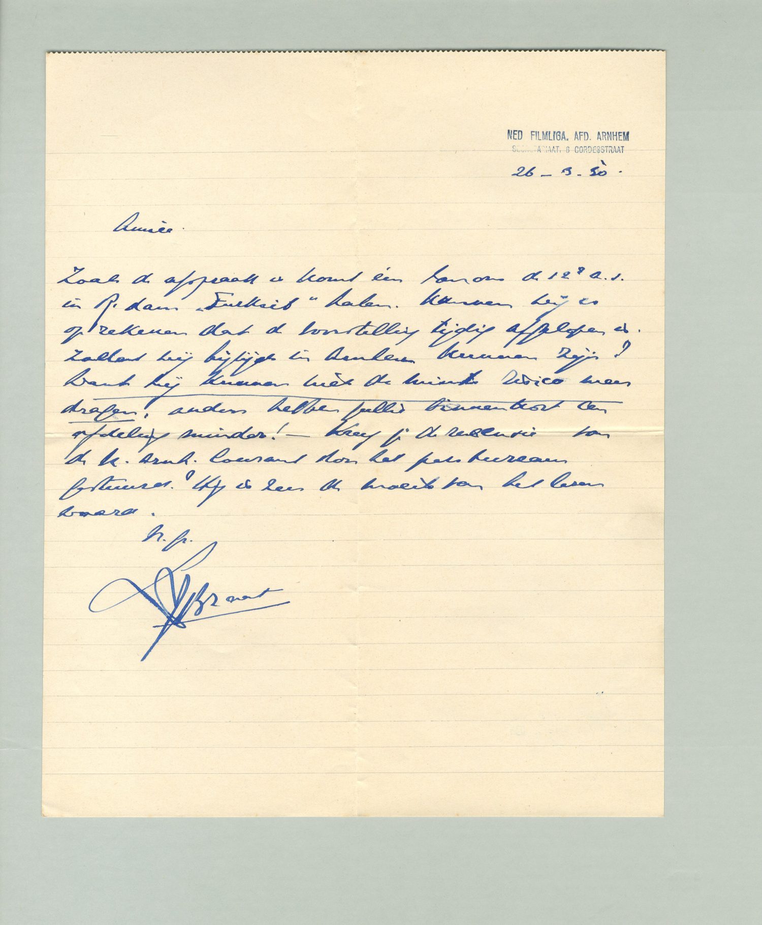 Zoals de afspraak is komt één [onleesbaar] de 12e a.s. in R'dam [onleesbaar] halen. Kunnen wij er op rekenen dat de voorstelling tijdig afgelopen is, zodat wij bijtijds in Arnhem kunnen zijn? Want wij kunnen niet de minste risico meer dragen, anders hebben jullie binnenkort een afdeling minder! - Kreeg je de recensie van de [N] Arnh.Courant door het pers bureau gestuurd? Zij is zeer de moeite van het lezen waard.