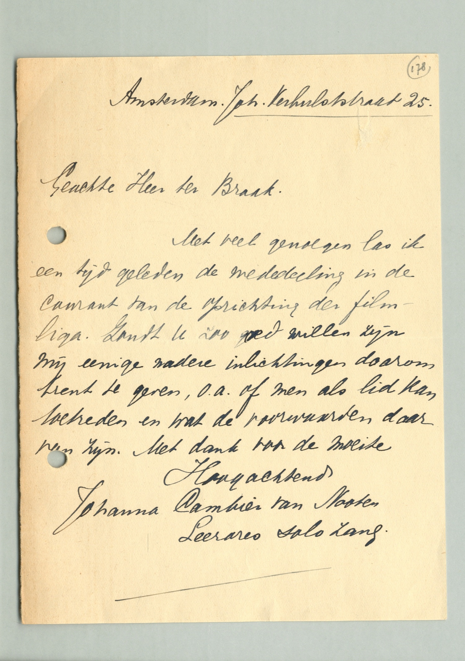 Met veel genoegen las ik een tijd geleden de mededeeling in de courant van de oprichting der filmliga. Zoudt U zoo goed willen zijn mij eenige nadere inlichtingen daaromtrent te geven, o.a. of men als lid kan toetreden en wat de voorwaarden daar van zijn. Met dank voor de moeite.