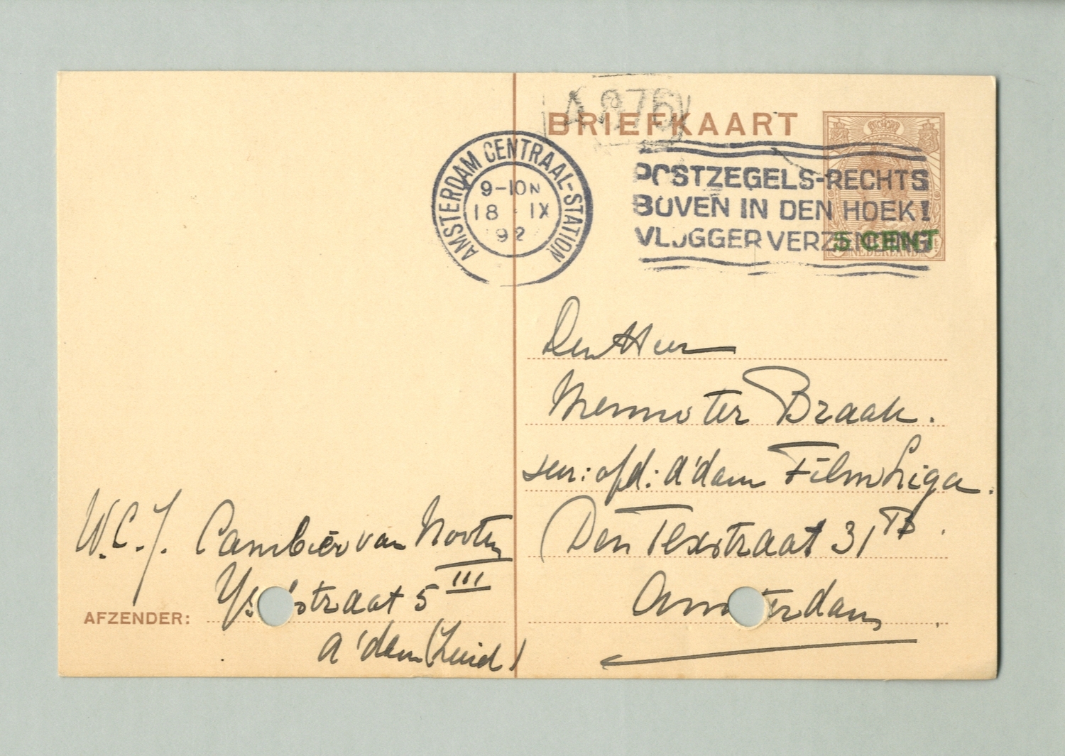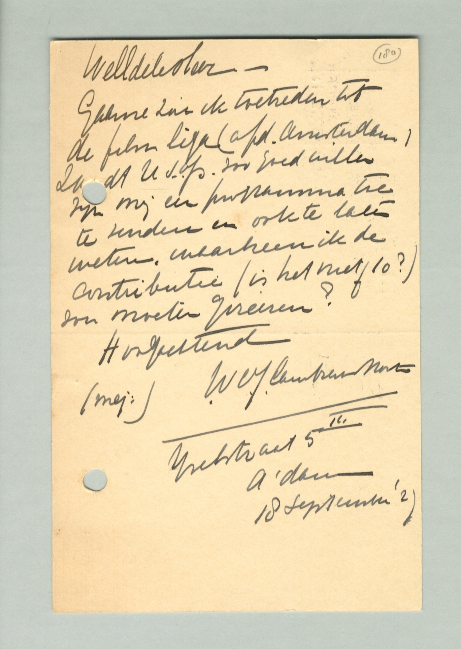 Gaarne zou ik toetreden tot de film liga (afd. Amsterdam). Zoudt u s.v.p. zoo goed willen zijn mij een programma toe te zenden en ook te laten weten, waarheen ik de contributie (is het niet f 10?) zou moeten gireeren?