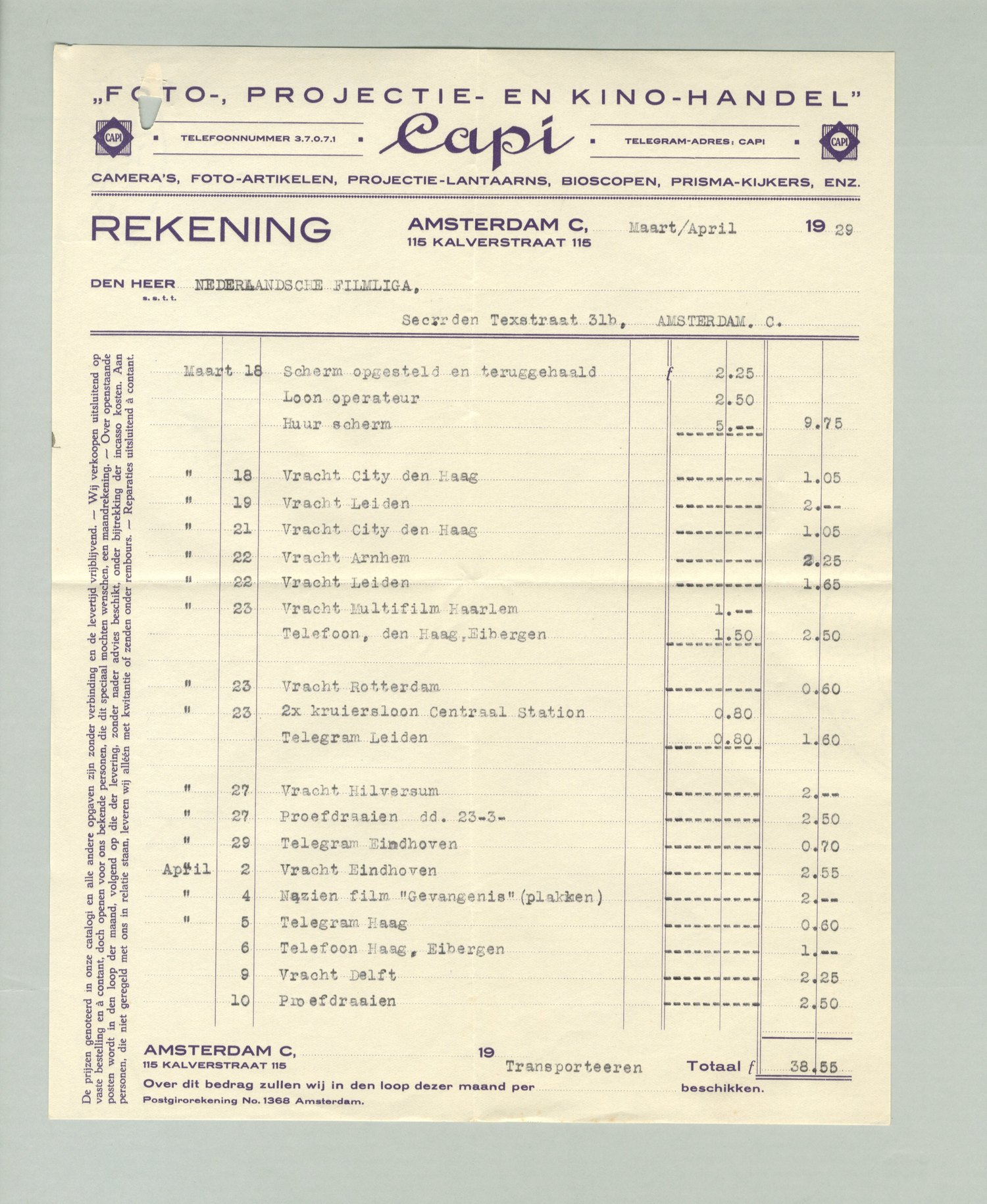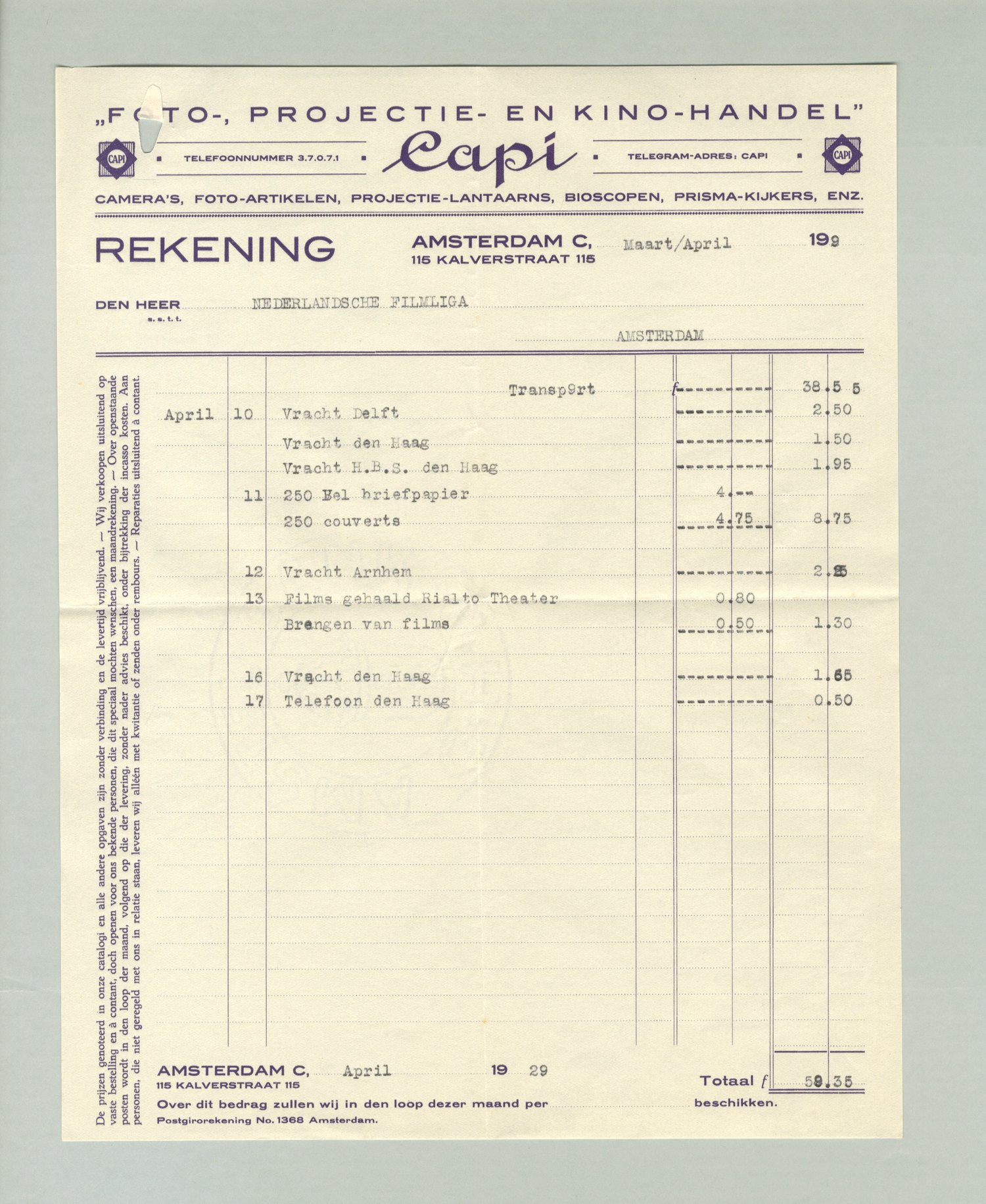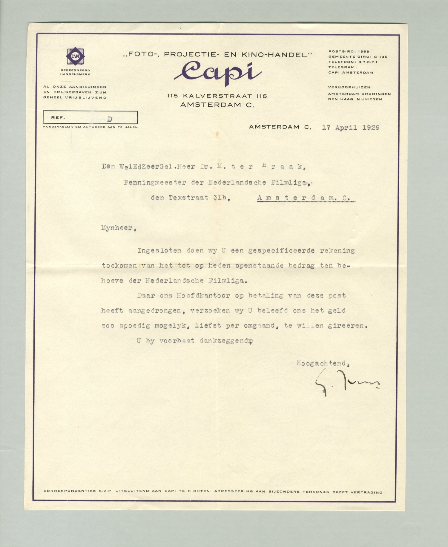 Ingesloten doen wij U een gespecificeerde rekening toekomen van het tot op heden openstaande bedrag ten behoeve der Nederlandsche Filmliga