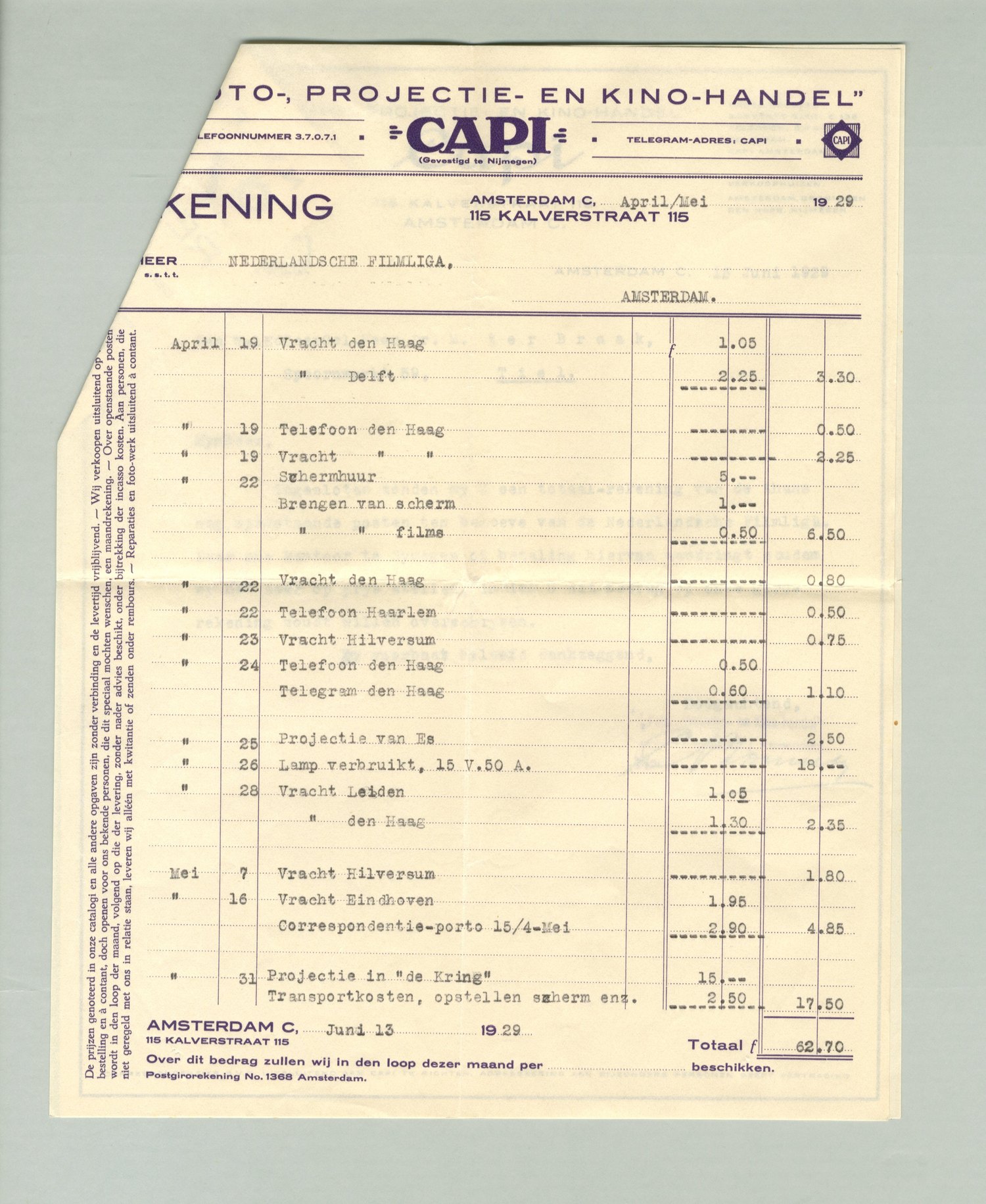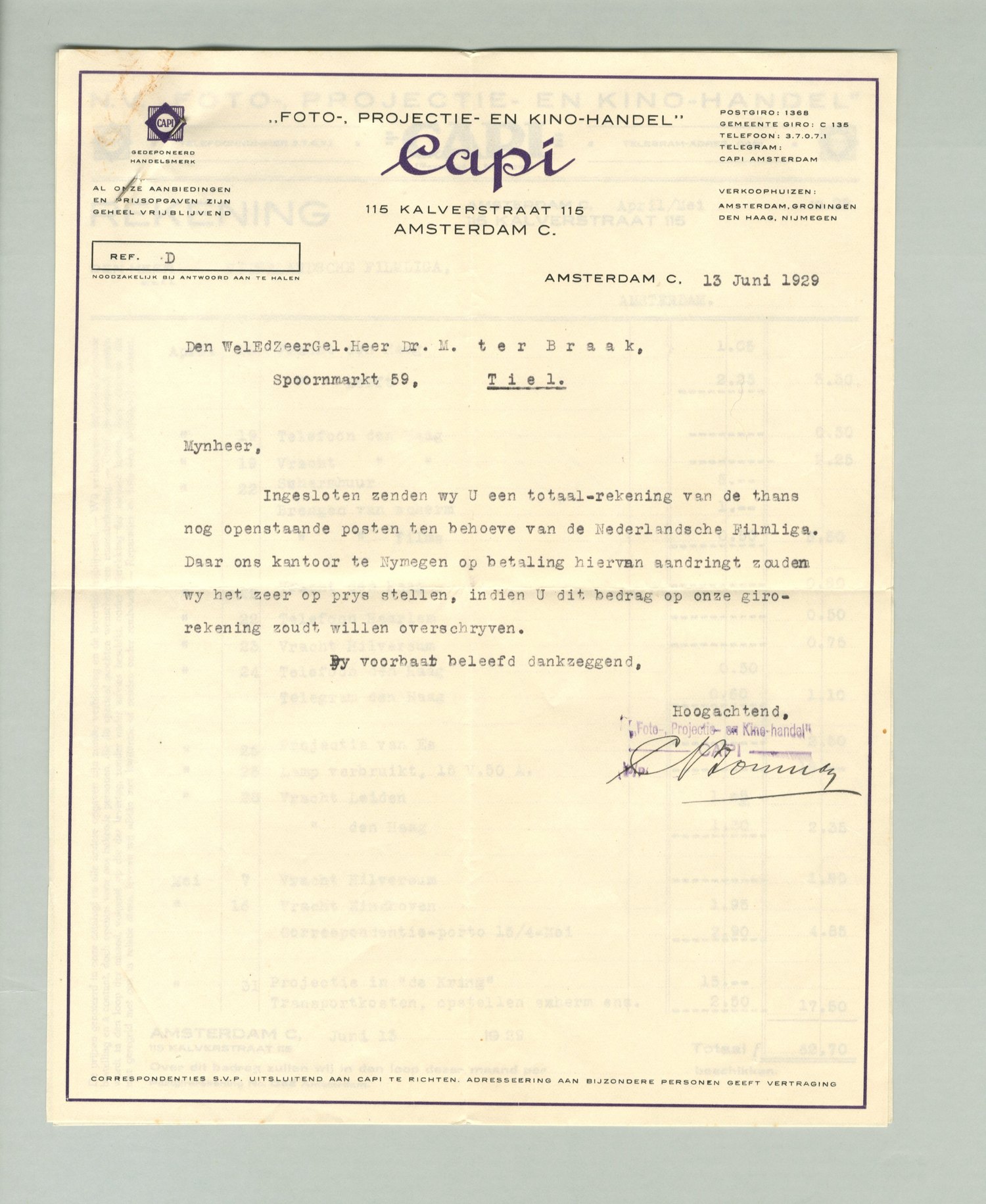 Ingesloten zenden wij U een totaal-rekening van de thans nog openstaande posten ten behoeve van de Nederlandsche Filmliga. Daar ons kantoor te Nijmegen op betaling hiervan aandringt zouden wij het zeer op prijs stellen, indien U dit bedrag op onze girorekening zoudt willen overschrijven.