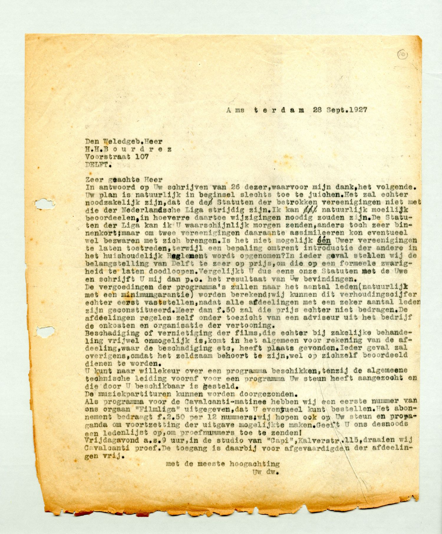 Als programma voor de Cavalcanti-matinee hebben wij een eerste nummer van ons orgaan ‘Filmliga’ uitgegeven, dat U eventueel kunt bestellen. Het abonnement bedraagt f2,50 voor 12 nummers; wij hopen ook op Uw steun en propaganda om voortzetting der uitgave mogelijk te maken. Geeft U ons desnoods een ledenlijst op, om proefnummers toe te zenden!