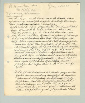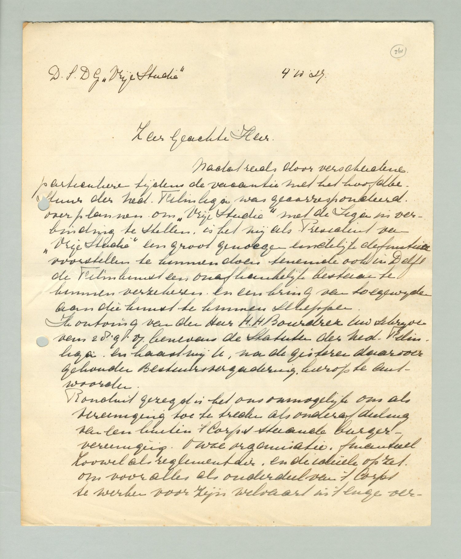 Ronduit gezegd is het ons onmogelijk om als vereeniging toe te treden als onderafdeeling van een buiten 't Corps staande burgervereeniging. Onze organisatie, finantieel zoowel als reglementair, en de ideëele opzet om voor alles als onderdeel van 't Corps te werken voor zijn welvaart in 't enge verband van dat Corps, maakt dat ons reglement op alle punten in strijd zou zijn met Uw Statuten. Daarenboven ligt 't in onze opzet dat het ons onmogelijk is onze vereeniging zelfs in de geringste mate afhankelijk te maken van een buiten het studentenleven en Corpsverband staande burgervereeniging. Mocht U dit argument niet zóó zeer na kunnen voelen, weest U er dan toch van verzekerd dat dit resultaat is van een ernstige bespreking onderzijds.