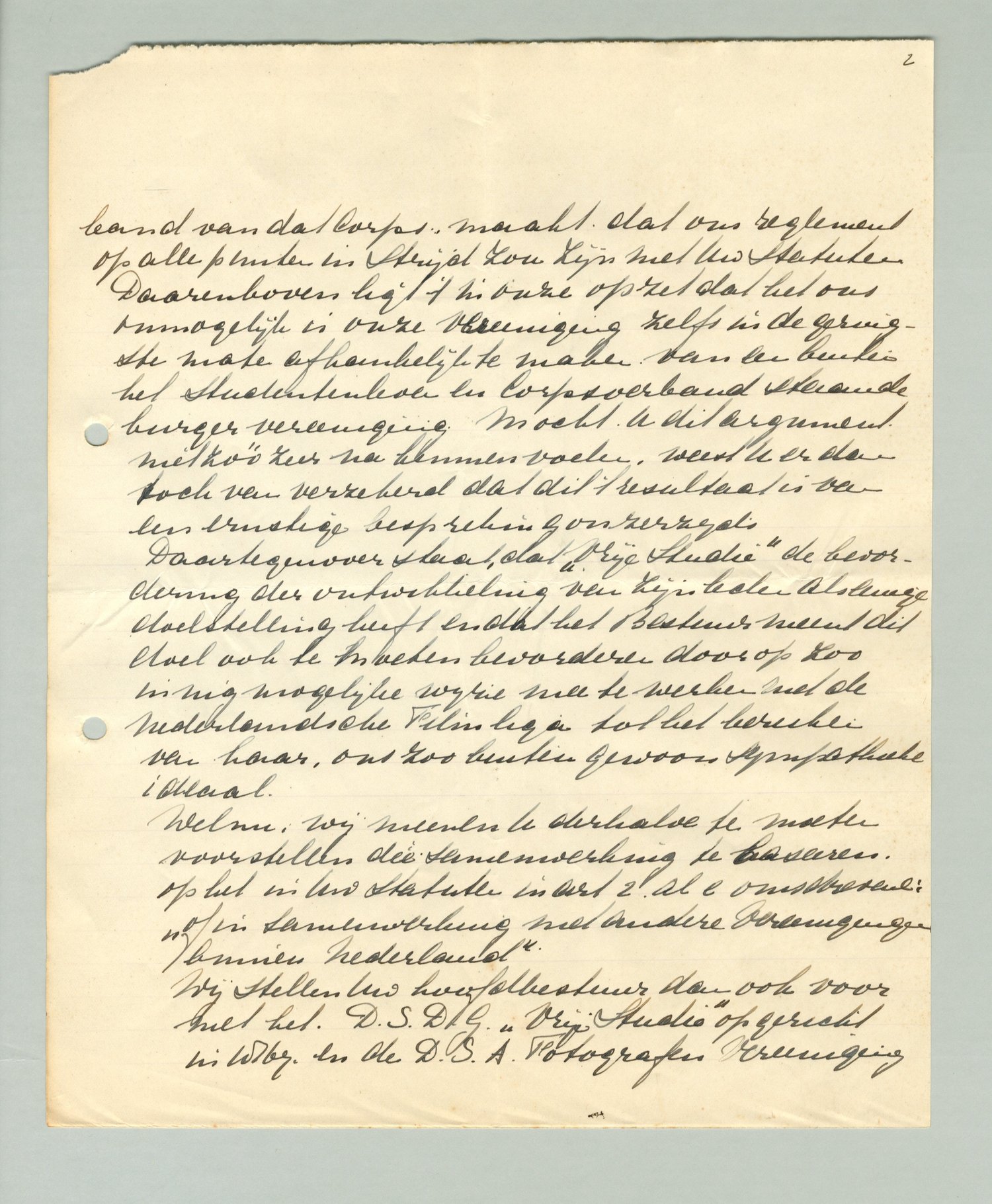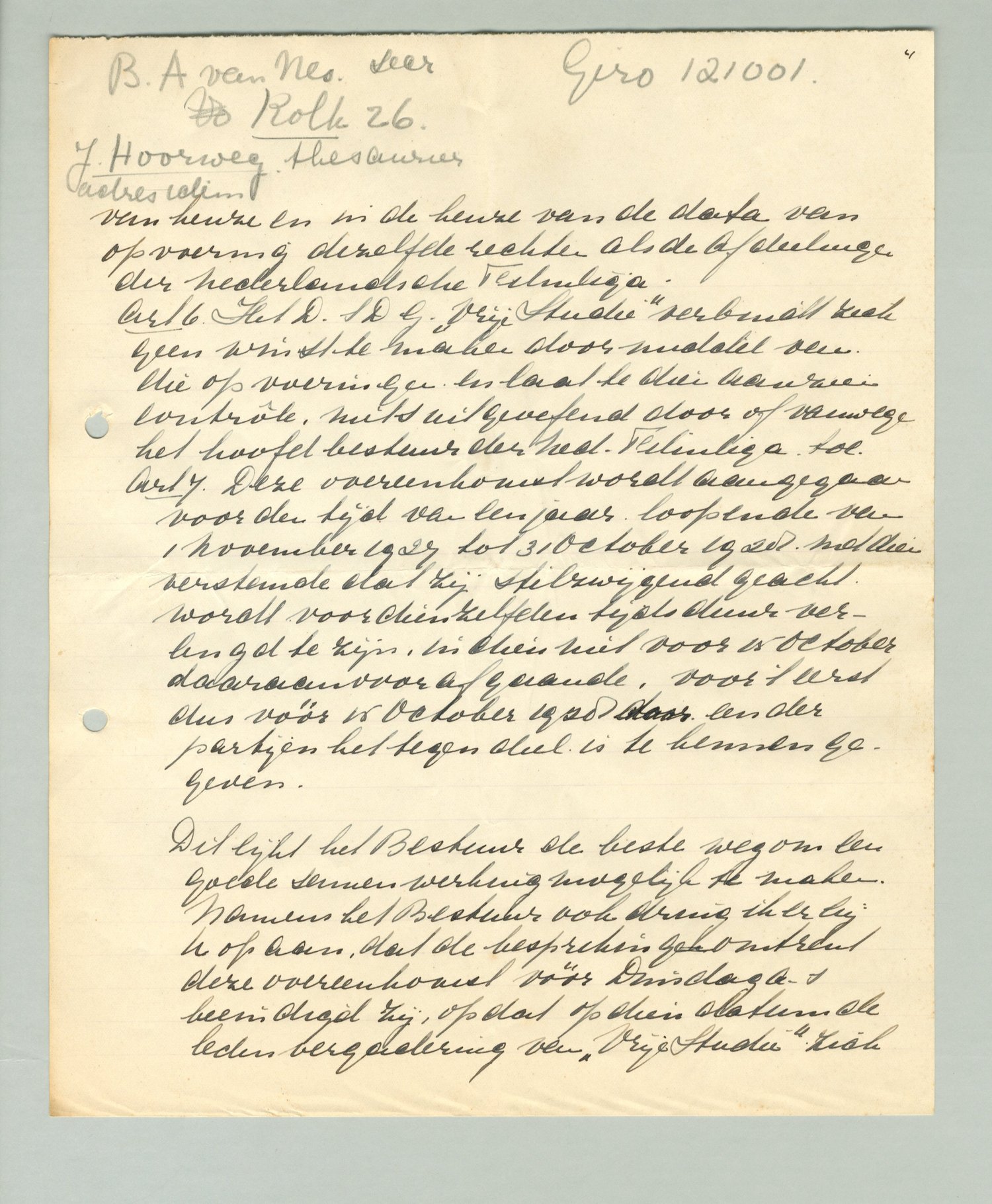 Ik kan echter niet nalaten er U op te wijzen dat het bericht in 't orgaan der Filmliga ‘Vrije Studie’ betreffende, op zijn minst voorbarig is te noemen en ook onjuist is, aangezien onze geldmiddelen niet toereikend zullen zijn de zaal der Stads Doelen te benutten en 't ons als Corpsvereeniging ten eenenmale onmogelijk is voor burgers een lidmaatschap ad hoc in te stellen.