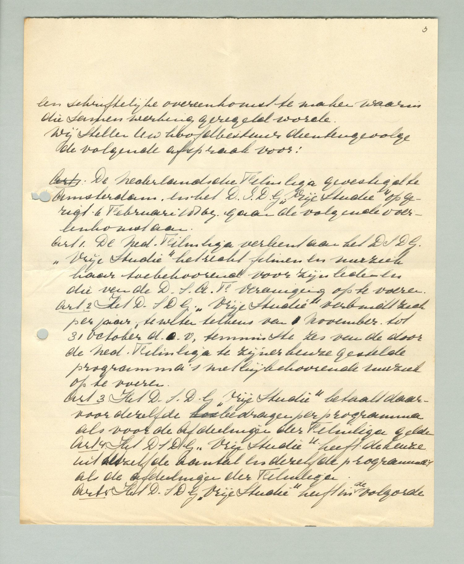 De Nederlandsche Filmliga gevestigd te Amsterdam en het D.S.D.G. ‘Vrije Studie’ opgericht 6 Februari 1867 gaan de volgende overeenkomst aan.
