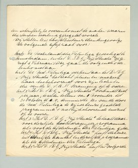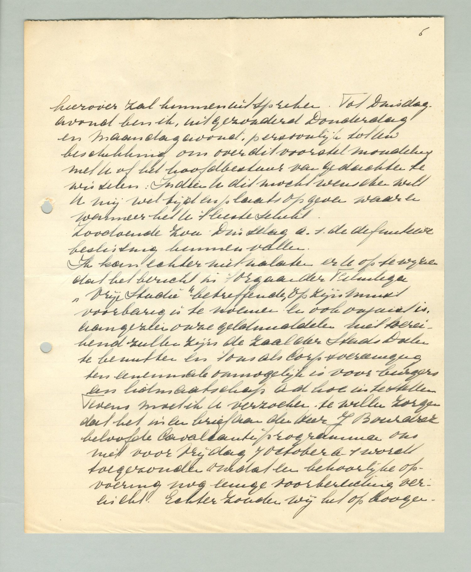 Tevens moet ik U verzoeken te willen zorgen dat het in een brief aan den Heer J. Bourdrez beloofde Cavalcanti-programma ons niet voor Vrijdag 7 October a.s. wordt toegezonden omdat een behoorlijke opvoering nog eenige voorbereiding vereischt. Echter zouden wij het op hoogen prijs stellen indien wij dit programma Vrijdag 14.10 zouden kunnen opvoeren en reeds Maandag a.s. of zoo mogelijk eerder over de muziek zouden kunnen beschikken. Indien dit niet mogelijk is wilt U ons wel de lijst der beschikbare data doen toekomen.