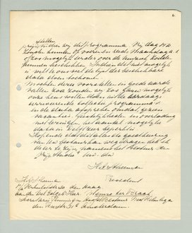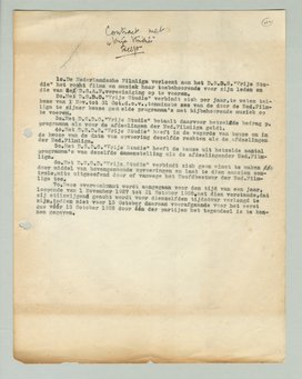 Dit lijkt het Bestuur de beste weg om een goede samenwerking mogelijk te maken. Namens het Bestuur ook dring ik er bij U op aan, dat de bespreking omtrent deze overeenkomst vóór Dinsdag a.s. beeindigd zij, opdat op dien datum de ledenvergadering van ‘Vrije Studie’ zich hierover zal kunnen uitspreken. Tot Dinsdagavond ben ik, uitgezonderd Donderdag en Maandagavond persoonlijk tot Uw beschikking om over dit voorstel mondeling met U of het hoofdbestuur van gedachten te wisselen. Indien U dit mocht wenschen wilt U mij wel tijd en plaats opgeven waar en wanneer het U 't beste schikt.