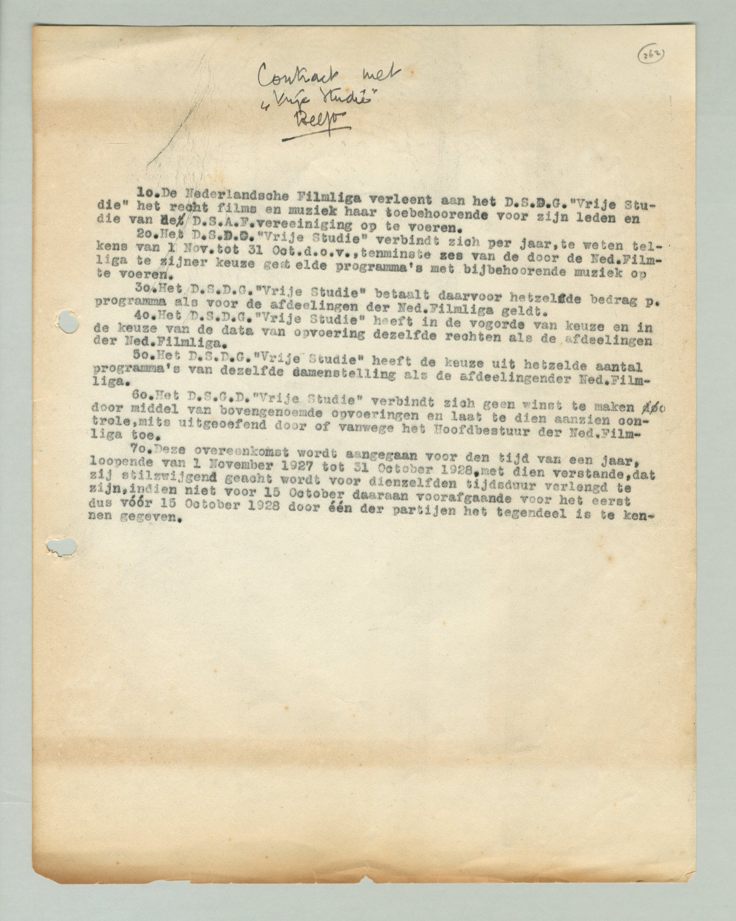 | 1o. | De Nederlandsche Filmliga verleent aan het D.S.D.G. ‘Vrije Studie’ het recht films en muziek haar toebehoorende voor zijn leden en die van het D.S.A.F.vereeniging op te voeren. |