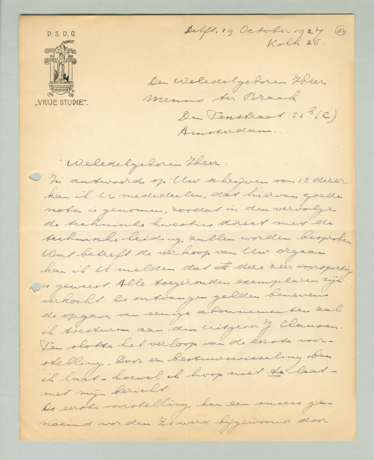 In antwoord op Uw schrijven van 13 dezer kan ik U mededeelen, dat hiervan goede nota is genomen, zoodat in den vervolge de technische kwesties direct met de technische leiding zullen worden besproken. Wat betreft de verkoop van Uw orgaan kan ik U melden dat deze zeer voorspoedig is geweest. Alle toegezonden exemplaren zijn verkocht. De ontvangen gelden benevens de opgave van eenige abonnementen zal ik toesturen aan den uitgever J. Clausen. Ten slotte het verloop van de eerste voorstelling. Door een bestuurswisseling ben ik laat - hoewel ik hoop niet te laat - met mijn bericht.