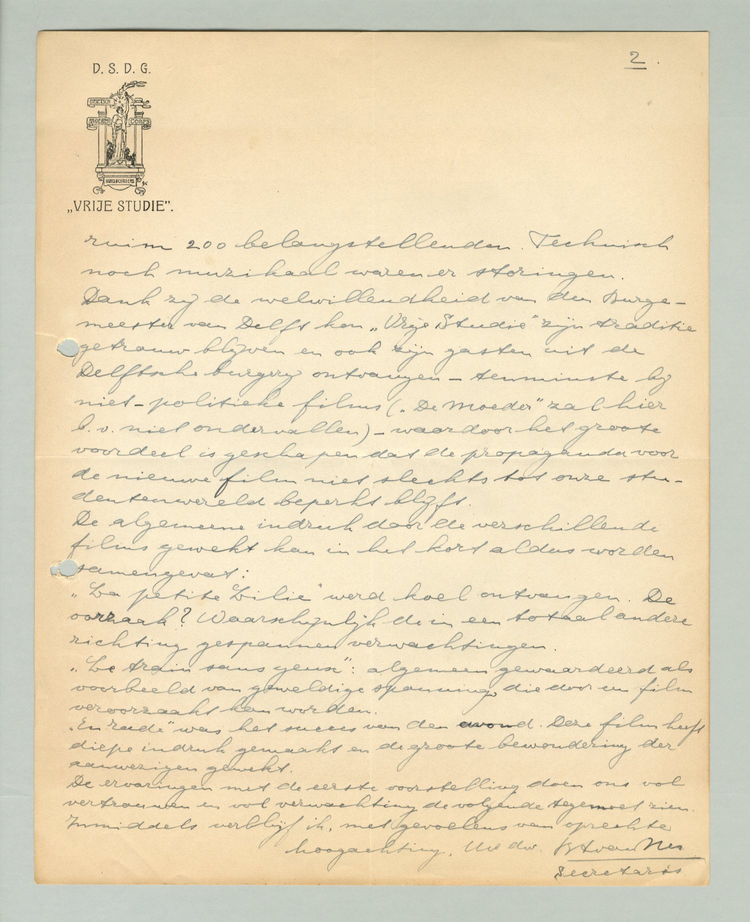 De eerste voorstelling kan een succes genoemd worden. Ze werd bijgewoond door ruim 200 belangstellenden. Technisch noch muzikaal waren er storingen. Dank zij de welwillendheid van den Burgemeester van Delft kan ‘Vrije Studie’ zijn traditie getrouw blijven en ook zijn gasten uit de Delftsche burgerij ontvangen - tenminste bij niet-politieke films (De Moeder zal hier b.v. niet onder vallen) - waardoor het groote voordeel is geschapen dat de propaganda voor de nieuwe film niet slechts tot onze studentenwereld beperkt blijft.