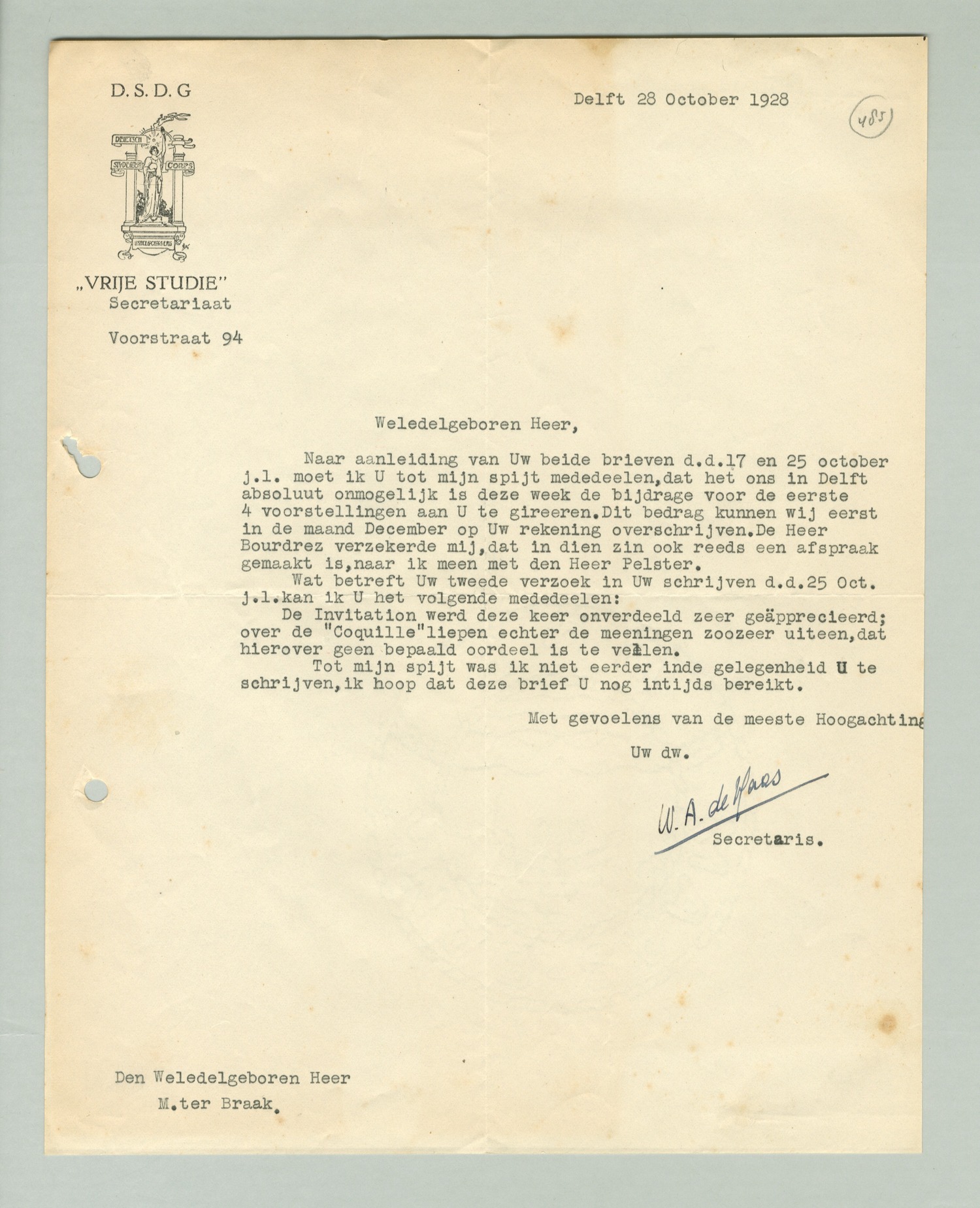Naar aanleiding van Uw beide brieven d.d. 17 en 25 october j.l. moet ik U tot mijn spijt mededeelen, dat het ons in Delft absoluut onmogelijk is deze week de bijdrage voor de eerste 4 voorstellingen aan U te gireeren. Dit bedrag kunnen wij eerst in de maand December op Uw rekening overschrijven. De Heer Bourdrez verzekerde mij, dat in dien zin ook reeds een afspraak gemaakt is, naar ik meen met den Heer Pelster.