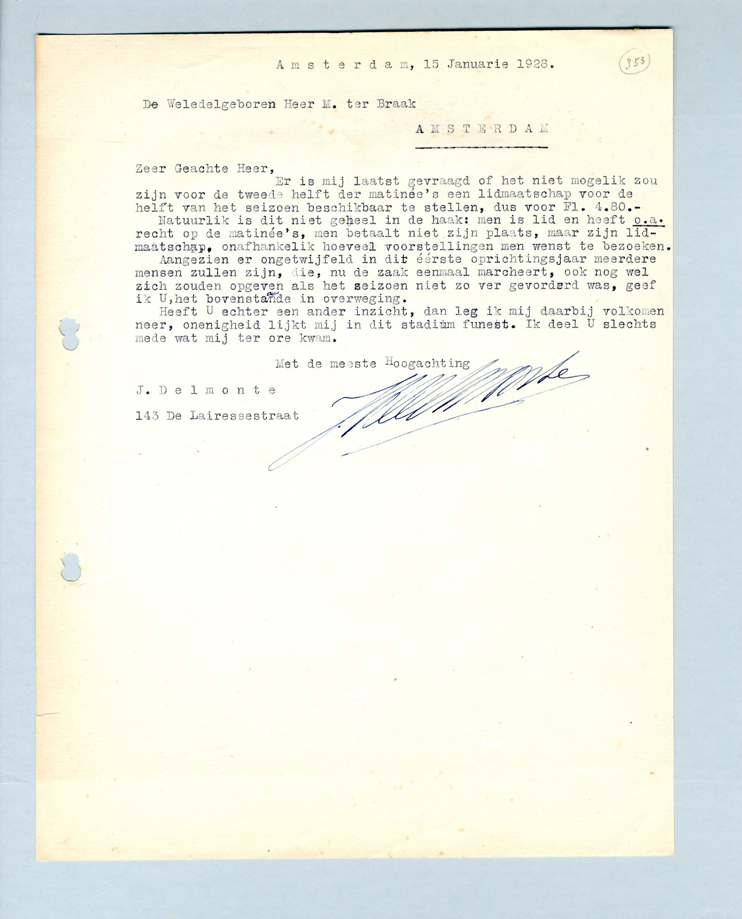 Er is mij laatst gevraagd of het niet mogelik zou zijn voor de tweede helft der matinée's een lidmaatschap voor de helft van het seizoen beschikbaar te stellen, dus voor Fl.4.80.-