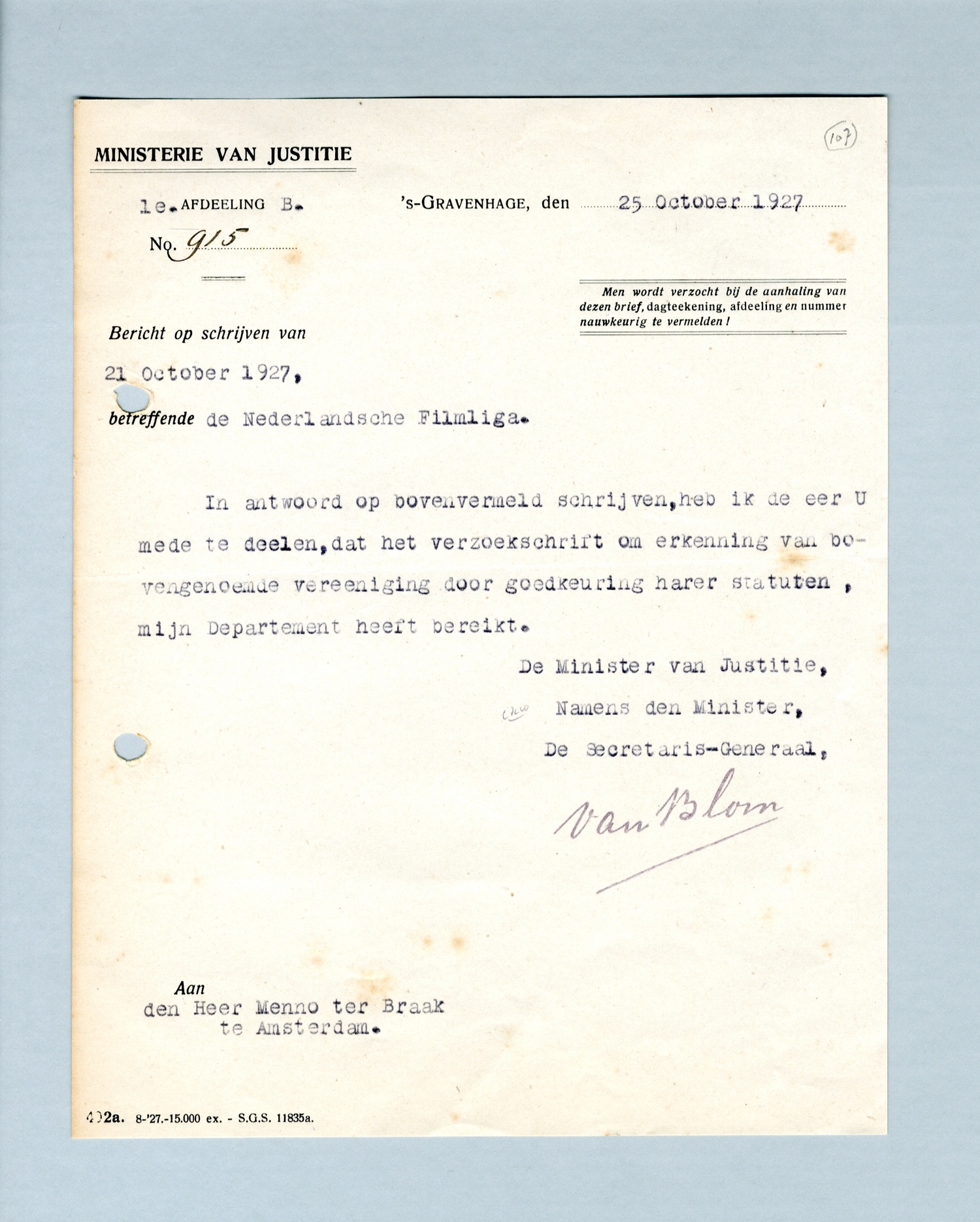 In antwoord op bovenvermeld schrijven, heb ik de eer U mede te deelen, dat het verzoekschrift om erkenning van bovengenoemde vereeniging door goedkeuring harer statuten, mijn Departement heeft bereikt.