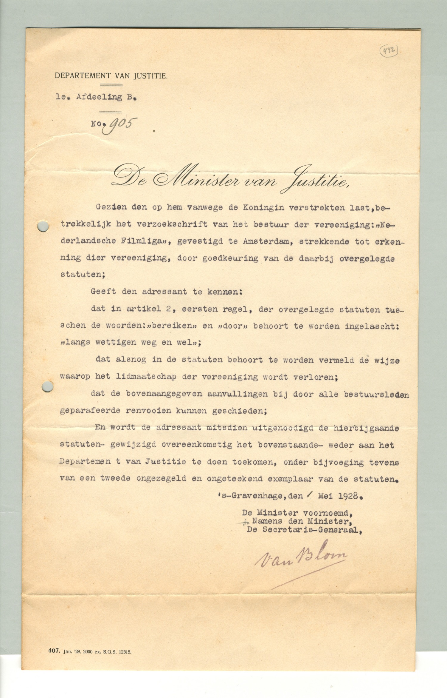 Gezien den op hem van wege de Koningin verstrekten last, betrekkelijk het verzoekschrift van het bestuur der vereeniging: ‘Nederlandsche Filmliga’, gevestigd te Amsterdam, strekkende tot erkenning dier vereeniging, door goedkeuring van de daarbij overgelegde statuten;