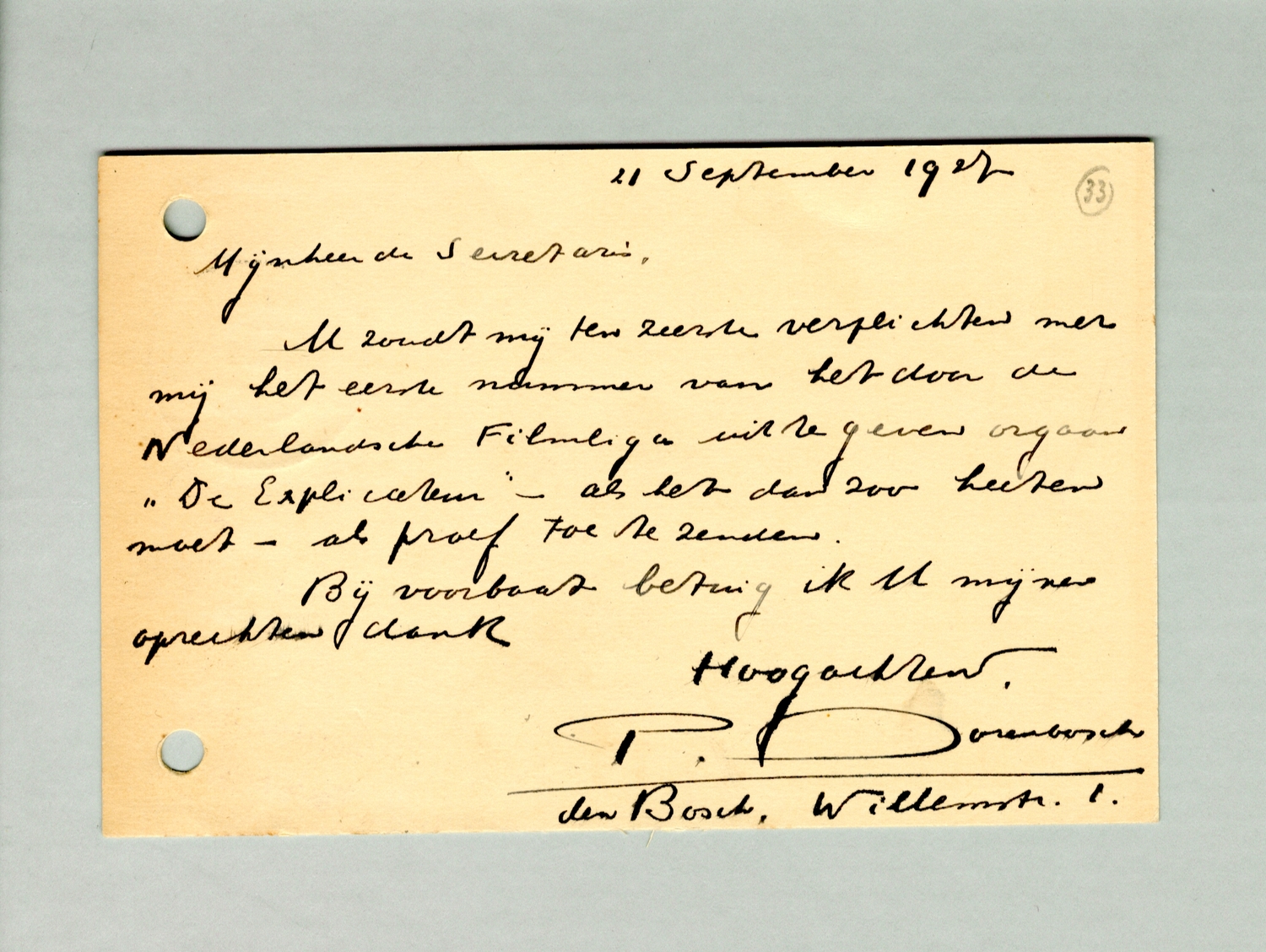 U zoudt mij ten zeerste verplichten met mij het eerste nummer van het door de Nederlandsche Filmliga uitgegeven orgaan De Explicateur - als het dan zoo heeten moet - als proef toe te zenden.