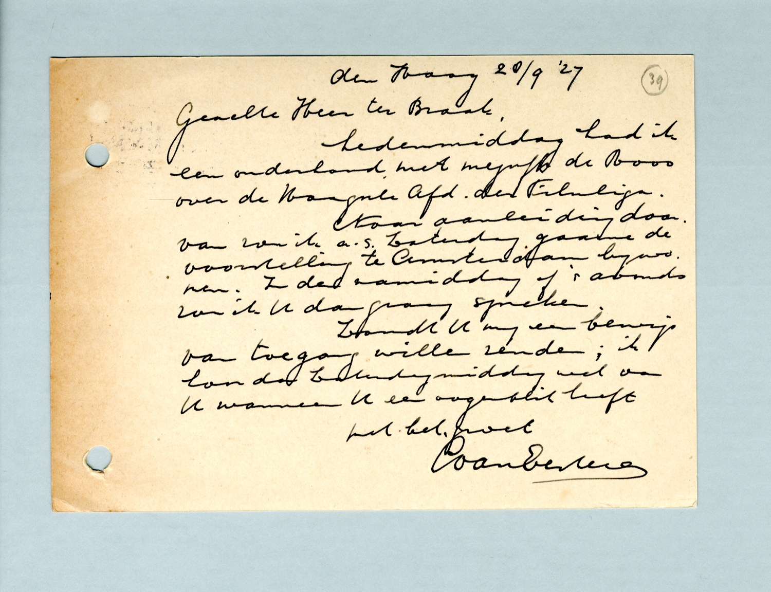 Zoudt U mij een bewijs van toegang willen zenden; ik hoor dan Zaterdagmiddag wel van U wanneer U een oogenblik heeft.