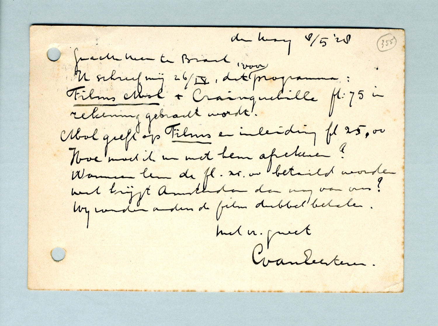 U schreef mij 26/IV, dat voor programma: Films Mol en Crainquebille fl.75 in rekening gebracht wordt.