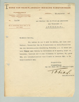 Wij hebben de eer U mede te deelen, dat onze heer Verboom, Voorzitter van de Filmcentrale en Onder-Voorzitter van den Soerabaiaschen Kunstkring Woensdag j.l. 15 dezer per s.s. Slamet naar Patria is vertrokken en U spoedig hoopt te bezoeken, teneinde met U over filmzaken te spreken. Wij gaven ZEd. een introductiebrief voor U mede en bevelen ZEd. in Uw welwillendheid aan.