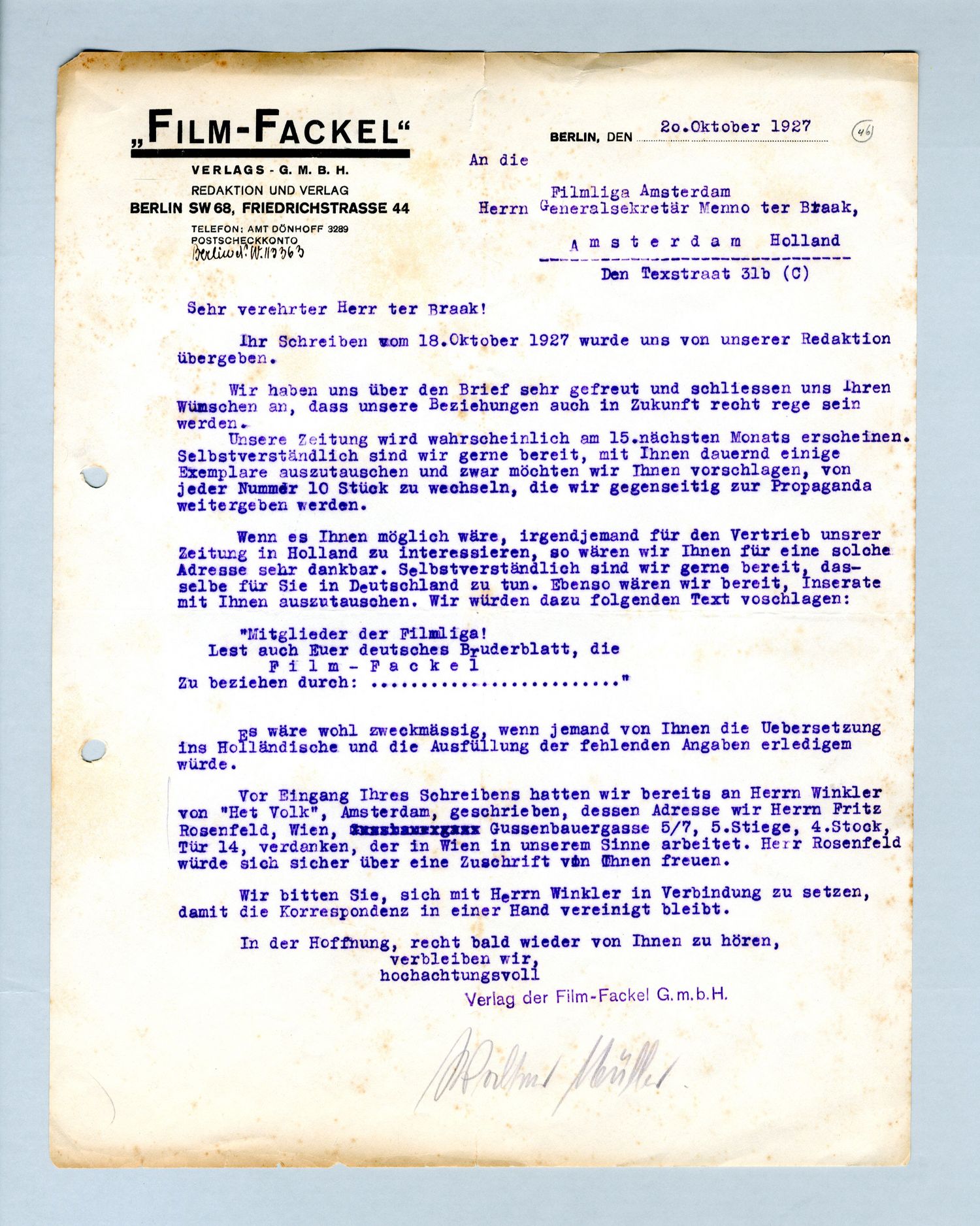 Vor Eingang Ihres Schreibens hatten wir bereits an Herrn Winkler von Het Volk, Amsterdam, geschrieben, dessen Adresse wir Herrn Fritz Rosenfeld, Wien, Gussenbauergasse 5/7, 5. Stiege, 4. Stock, Tür 14, verdanken, der in Wien in unserem Sinne arbeitet. Herr Rosenfeld würde sich sicher über eine Zuschrift von Ihnen freuen.