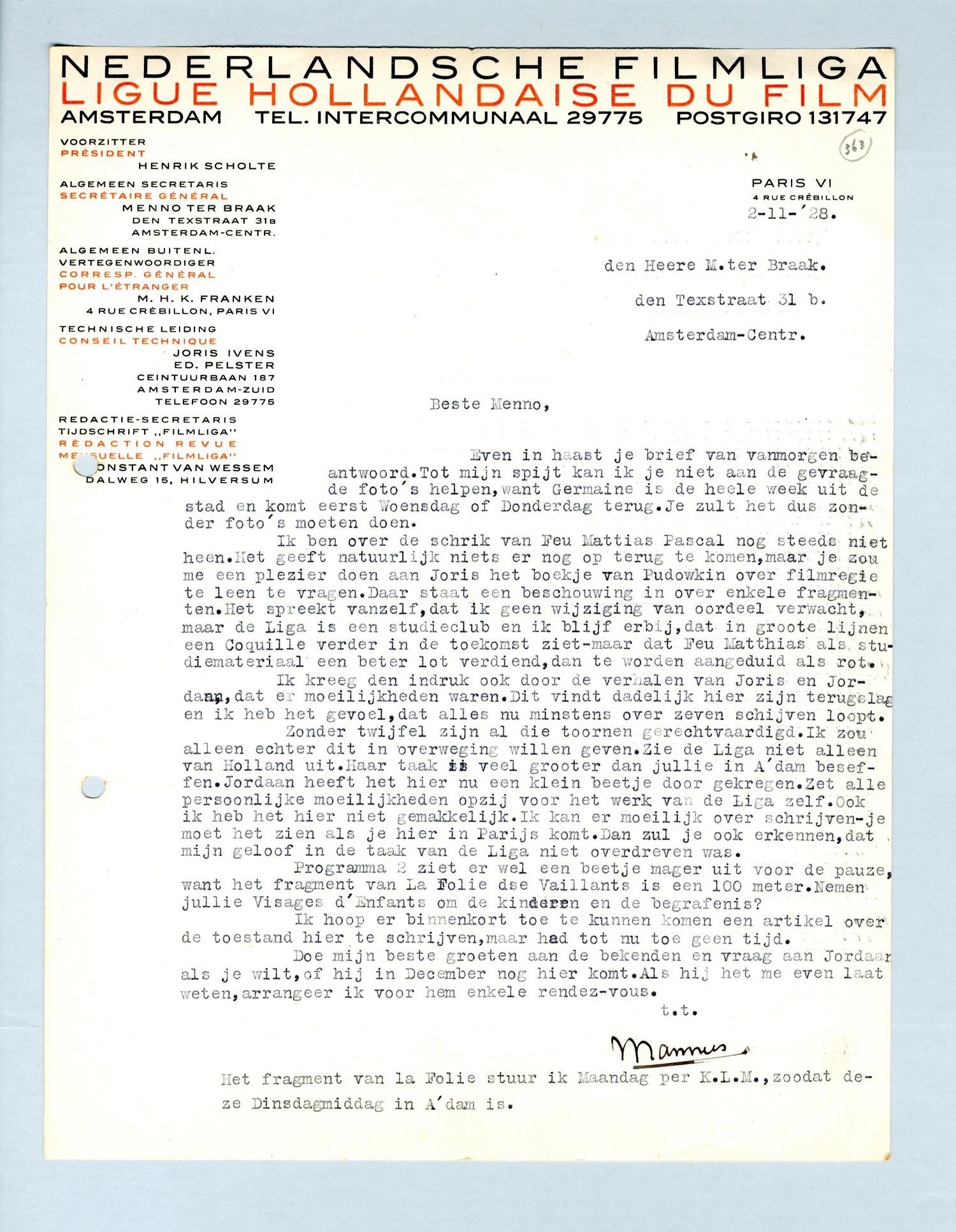 Ik ben over de schrik van Feu Mattias Pascal nog steeds niet heen. Het geeft natuurlijk niets er nog op terug te komen, maar je zou me een plezier doen aan Joris het boekje van Pudowkin over filmregie te leen te vragen. Daar staat een beschouwing in over enkele fragmenten. Het spreekt vanzelf, dat ik geen wijziging van oordeel verwacht, maar de Liga is een studieclub en ik blijf erbij, dat in groote lijnen een Coquille verder in de toekomst ziet - maar dat Feu Matthias als studiemateriaal een beter lot verdiend, dan te worden aangeduid als rot.