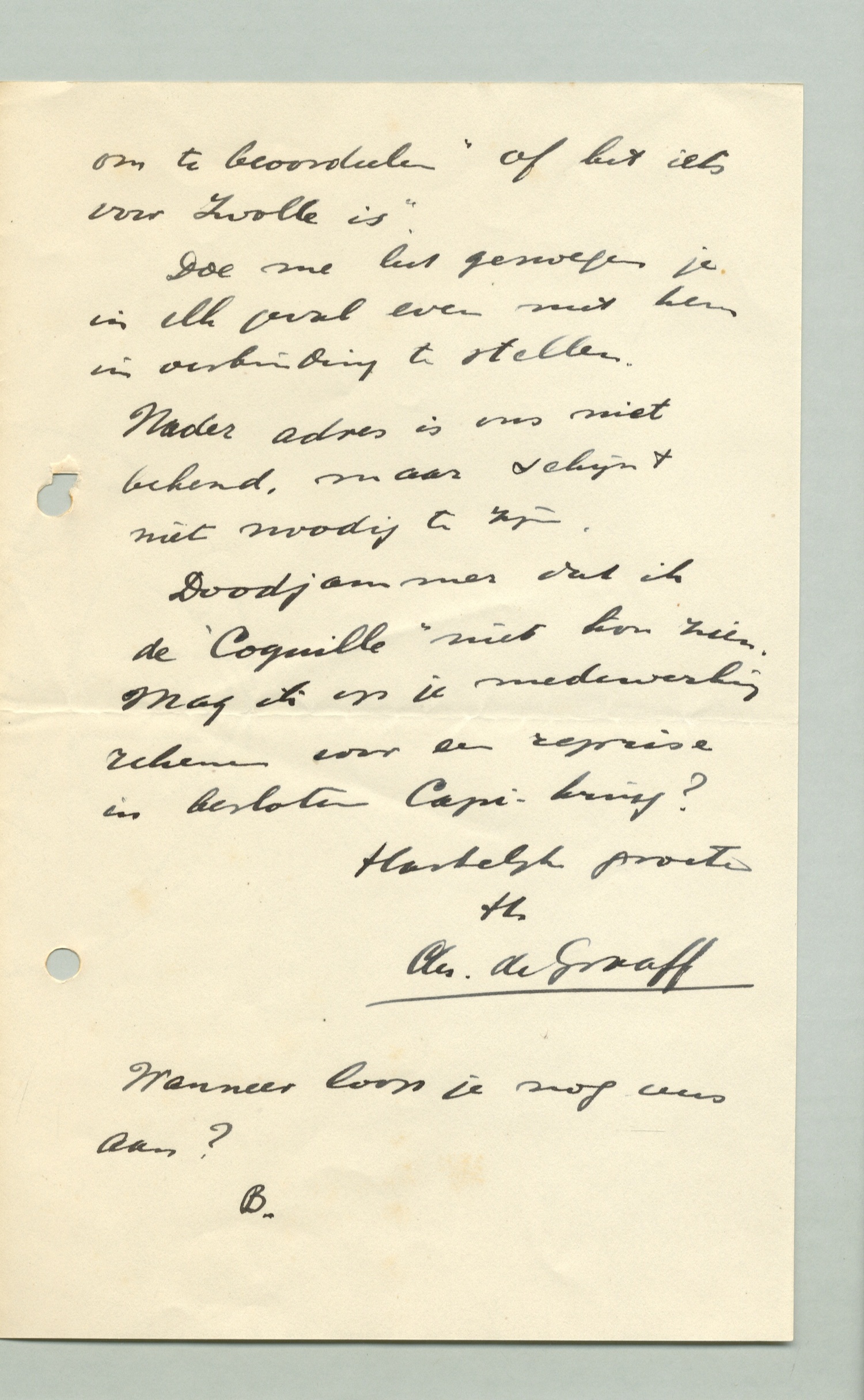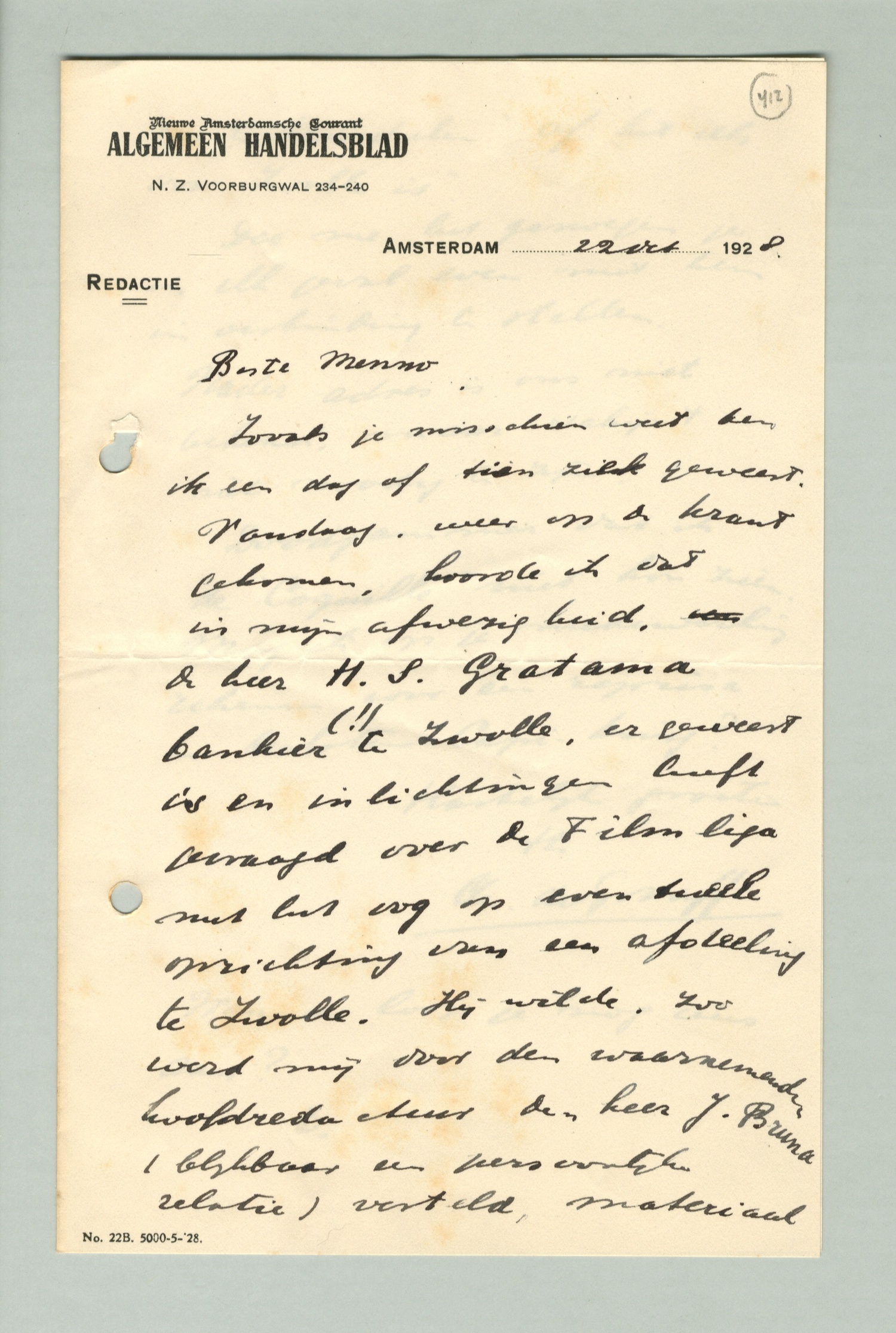 Zooals je misschien weet ben ik een dag of tien ziek geweest. Vandaag, weer op de krant gekomen, hoorde ik dat in mijn afwezigheid, de heer H.S. Gratama, bankier (!) te Zwolle, er geweest is en inlichtingen heeft gevraagd over de Filmliga met het oog op eventueele oprichting van een afdeeling te Zwolle. Hij wilde, zoo werd mij door den waarnemenden hoofdredacteur den heer J. Bruna (blijkbaar een persoonlijke relatie) verteld, materiaal om te beoordeelen ‘of het iets voor Zwolle is’.