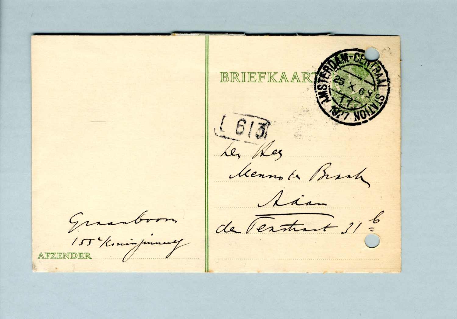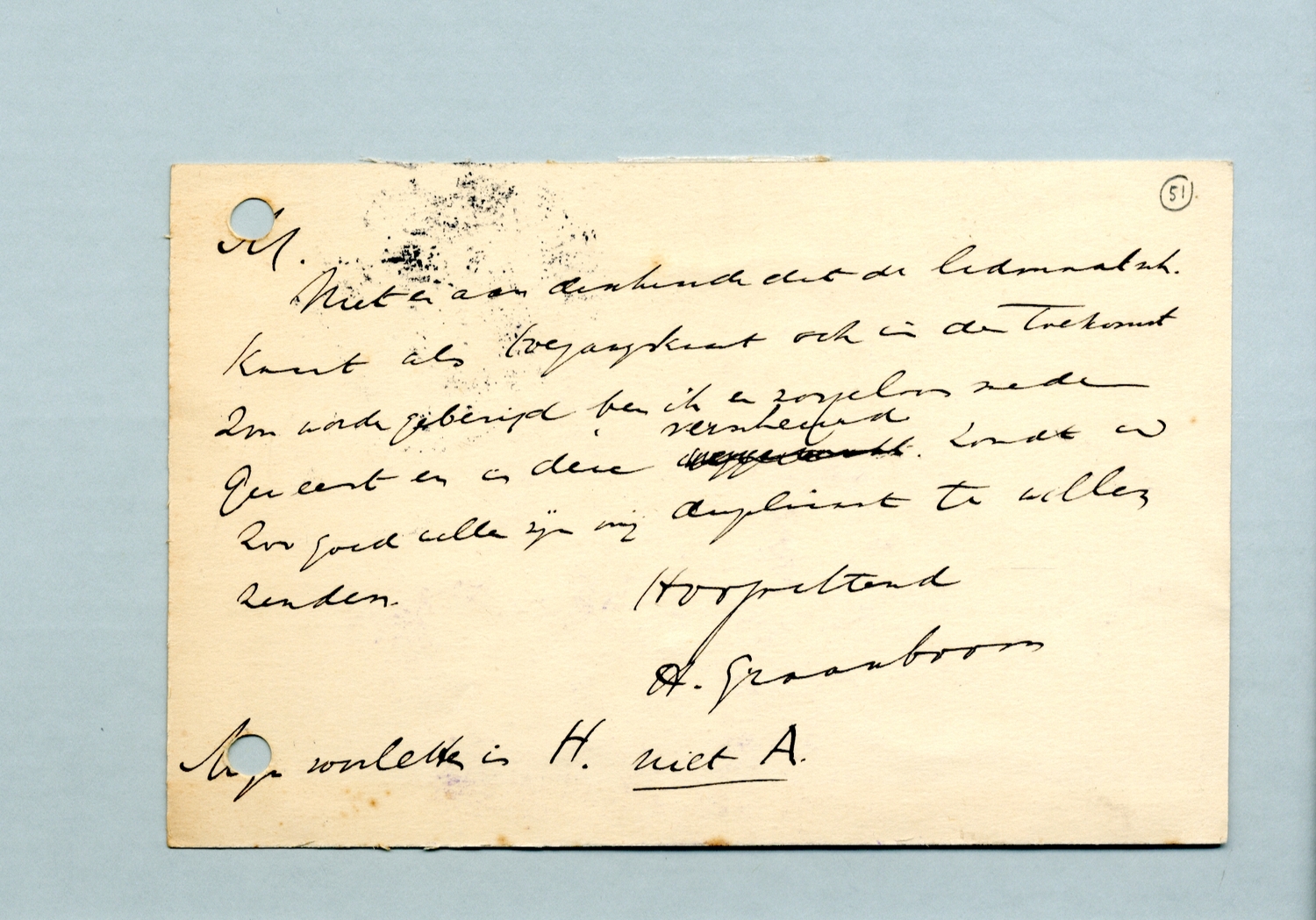 Niet er aan denkende dat de lidmaatsch.kaart als toegangskaart ook in den toekomst zou worden gebezigd ben ik er zorgeloos mede geweest en is deze verscheurd. Zoudt u zoo goed willen zijn mij [onleesbaar] te willen zenden.
